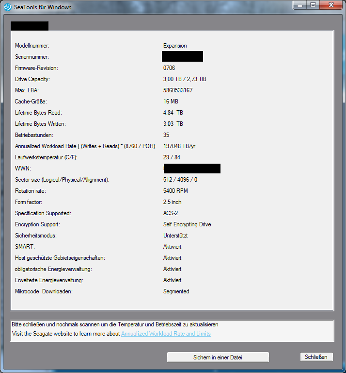 In einem weiteren Edit noch Informationen von SeaTools zu der Seagate Expansion in Form eines weiteren Screenshots eingefügt.