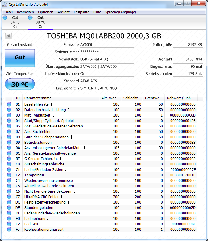 Edit: Habe gerade CrystalDiskInfo auf meine andere Externe angewendet (Toshiba, siehe Bild). Die hat bei der Lesefehlerrate und Anz. Suchfehler bessere Werte. (Übrigens, die Toshiba hat glaube ich einen auf die Platine gelöteten USB-Controller, die Seagate hat einen auf den SATA-Anschluss aufgesteckten USB Adapter). Ist das schlimm?
