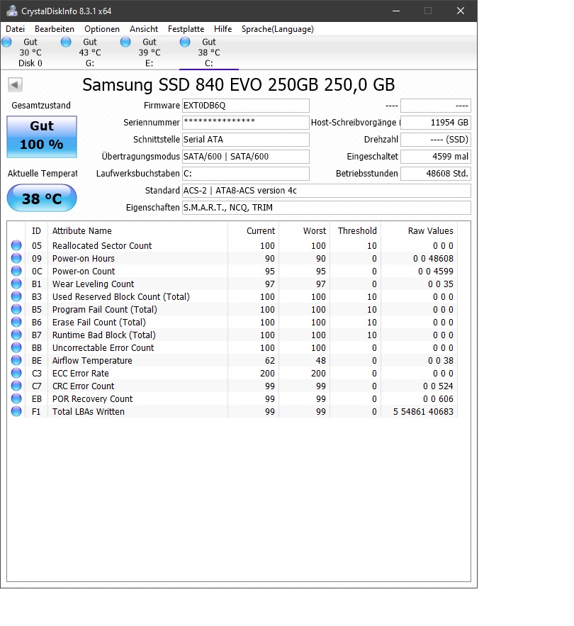 840 EVO: 11954GB Host-Schreibvorgänge, Kapazität 232GB Wear-Level-Count: 35