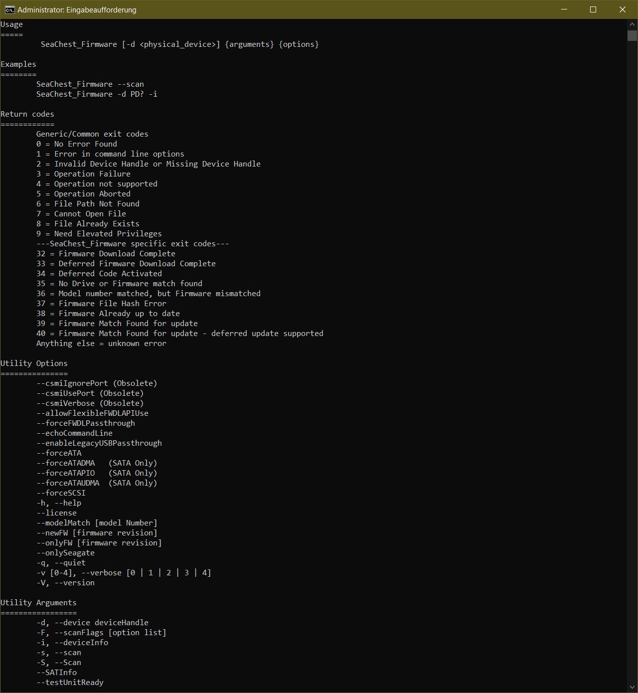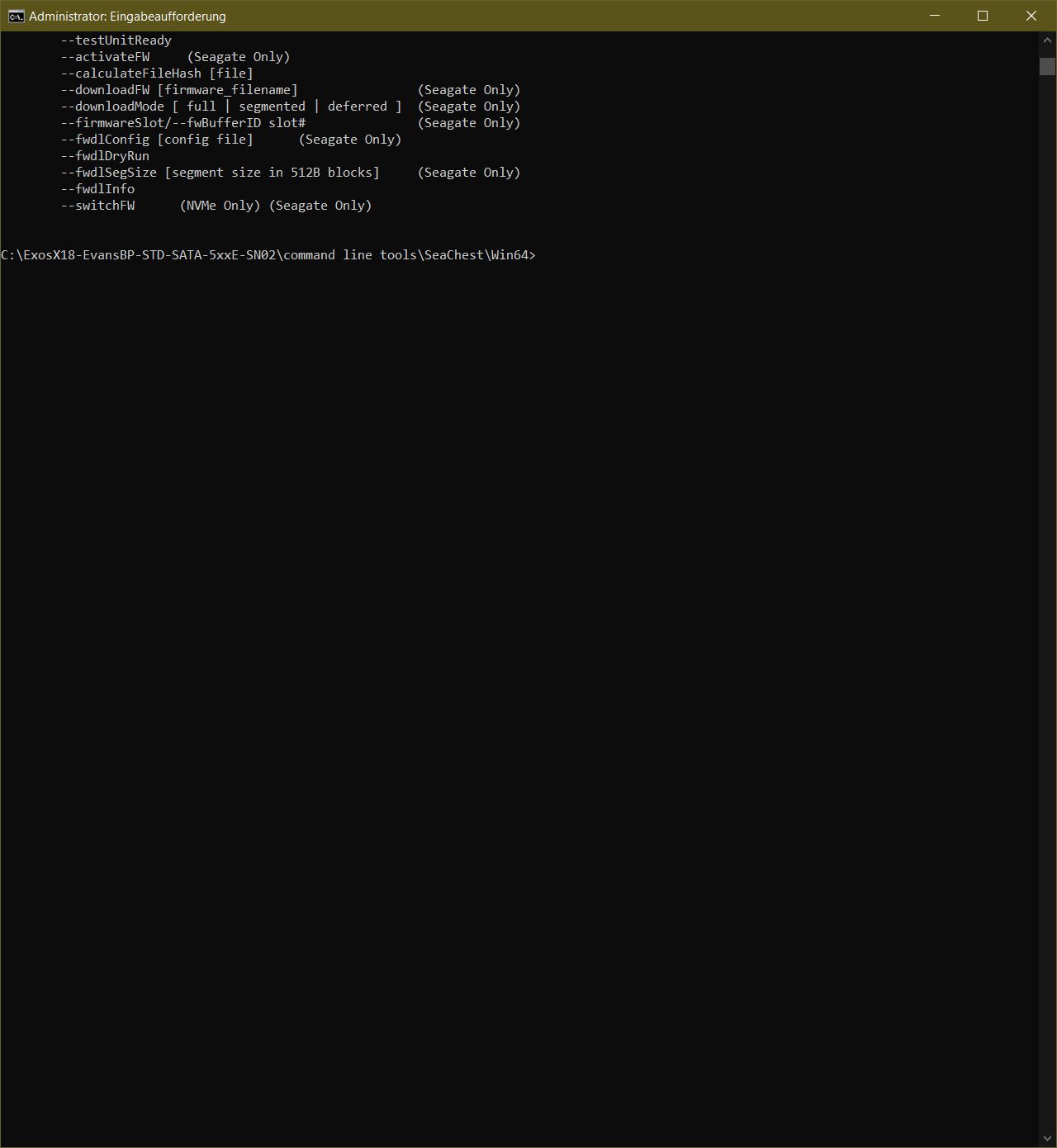 Benutze das offizielle Seagate-Tool "SeaChest" v.3.0.0 unter einer x64 Windows-Umgebung (kein Boot-Stick). Laut einschlägigen Foren sollte das aber nicht das Problem sein.