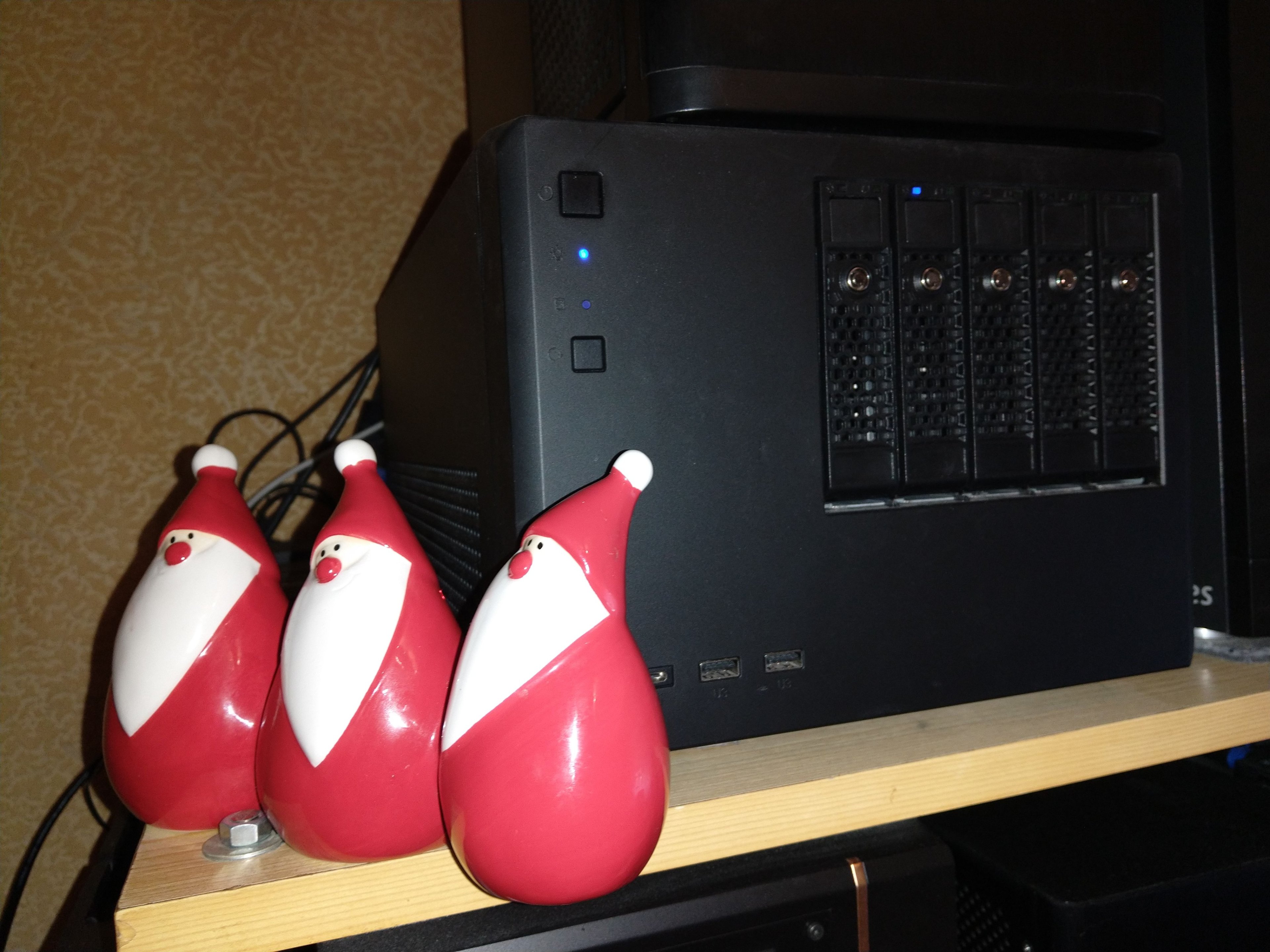 NAS und Backup-NAS, je 4TB für virtual Disks und Backups, Musik-Archiv, Mediathek-Downloads und Dokumenten-Bibliothek. Da die kleinen eisernen Wölfchen schon kräftig rackern und das aber nicht alles allein schaffen, könnten sie etwas Verstärkung in ihrer Herde sehr gut gebrauchen. Jeweils zwei Slots sind noch frei, ich könnte also sofort einschieben und das RAID erweitern.