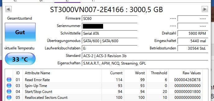 Im übrigen ebenfalls eine immer noch tadellos laufende Seagate IronWolf, die dann als zweite externe Backupplatte weiter werkeln darf.