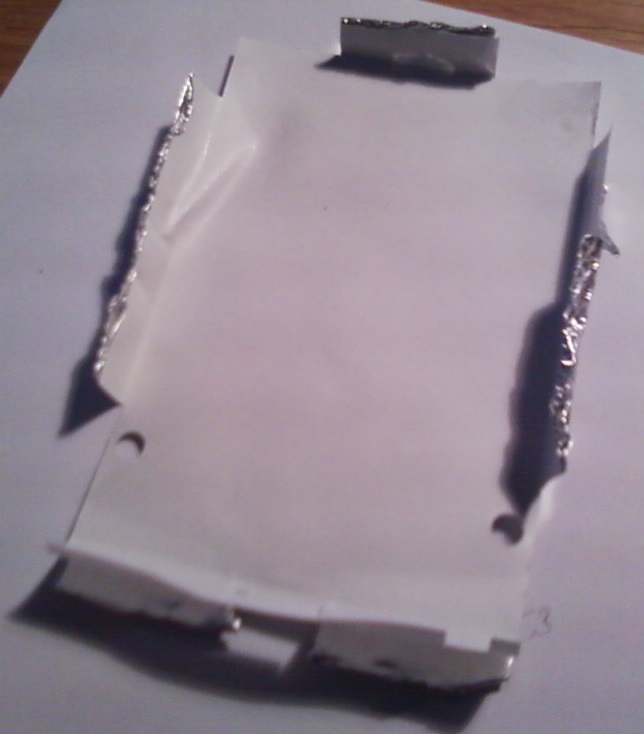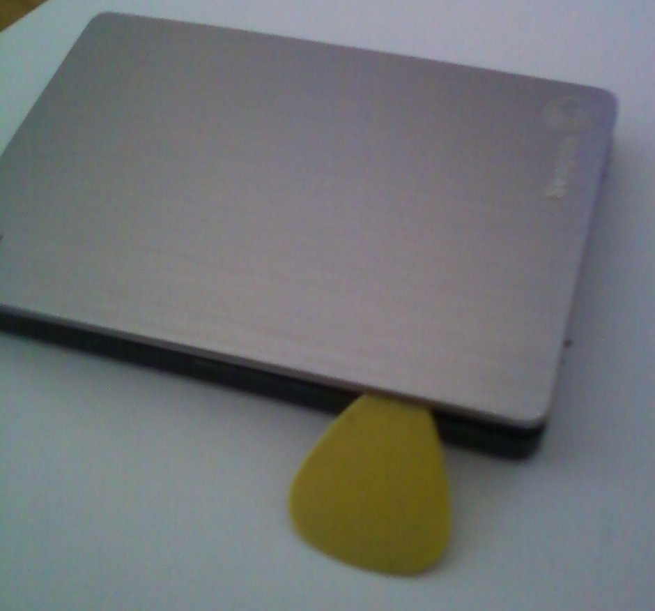 Im ersten Schritt wird die Metallabdeckung von schwarzen Gehäuse gehoben. Um hier in den Spalt zwischen Bauteilen zu kommen haben ich zuerst ein Cutter-Messer verwendet. Danach habe ich mit einem Gitarrenplek die restliche Schale aufgehebelt. Mit dem Cutter-Messer kann man sich sehr schnell das Gehäuse vermacken (was ja eigentlich nicht so tragisch ist. Eine Nutzung entgegen der normalen Schnittrichtung des Messers war auch nicht hilfreich, da das Messer hier besonders schnell abrutscht. Wenn man hier ein stumpferes Messer nutzt ist dies denk ich mal von Vorteil, allerdings muss die Klinge sehr dünn sein um in den Spalt zu kommen. Sobald man den Spalt an einer Stelle etwas vergrößtert hat, sollte man dann mit einem stumpfen Gegenstand weitermachen. Mit dem biegsamen Gitarrenplek kann man, sobald man den Spalt rundherum aufgehebelt hat, vollständig unter das Gehäuse gehen und das Gehäuse langsam aufhebeln.