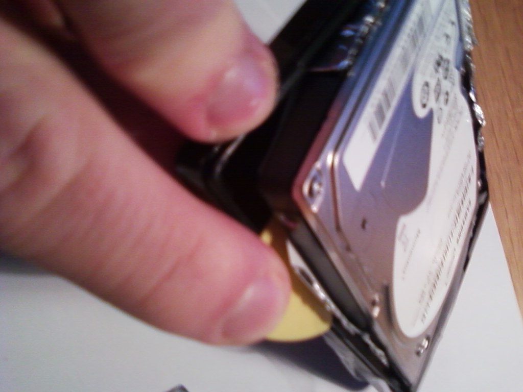 Mit dem Plek kann man jetzt auch die Festplatte aus der unteren Schale lösen. Dazu auf der zum Anschluss gegenüberliegenden Seite mit dem Plek unter die Festplatte, Alufolien und Kartonschicht gehen und vorsichtig hebeln.