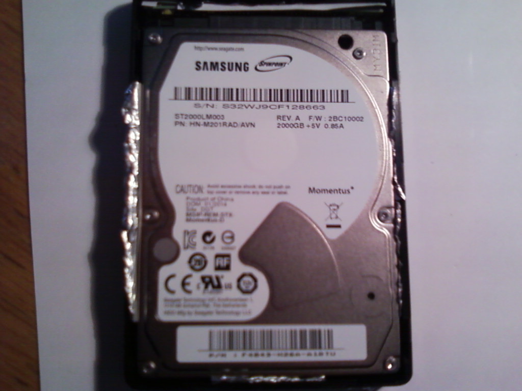 Nachdem nun also die Festplatte sichtbar wird, ist der Moment der Wahrheit gekommen. Handelt es sich um die M9T oder um die M9TU. Die Modellnummer ST2000LM003 verrät uns, dass es sich um die M9T handelt. Glück gehabt!