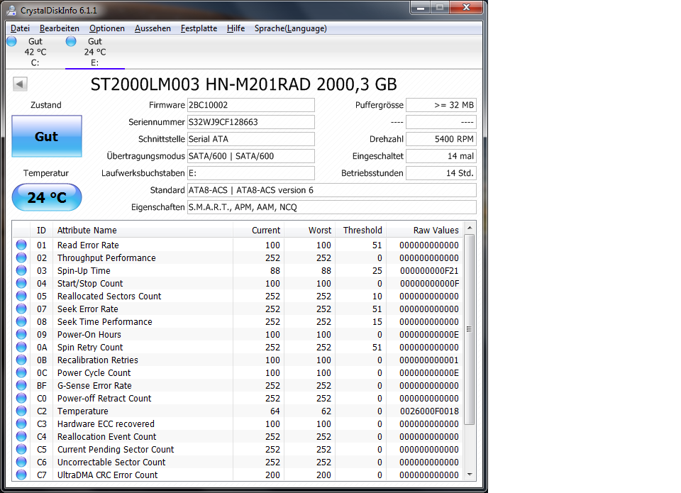 Da bei Öffnen die Garantie futsch ist, sollte die Backup Plus Slim erstmal getestet werden. Während CrystalDiskInfo die Platte mit "gut" bewertet und keinen Fehler findet, gibt HDTune eine Warnung beim SMART Wert "0B: calibration retry count". SpeedFan liest die SMART Werte dann wieder wie CrystalDiskInfo. Das Herstellertool Seatools lief bei mir nur in der Windows-Version im abgesicherten Modus. Die Dos-Variante unterstützt kein USB und die Windows-Version bleibt im normalen Betrieb beim suchen der Geräte bei den SCSI-Geräten stehen. Seatools konnte in meinem Fall leider keine SMART Werte auslesen, der Langzeittest bestand die Festplatte allerdings, weshalb ich auf einen Lese- /Interpretationsfehler von HDTune hoffe.