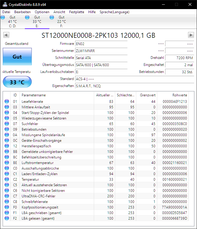 ich habe eine nagelneue Seagate IronWolf Pro 12 TB HDD, NAS Festplatte intern, 3.5 Zoll, 7200 U/Min, CMR, 256 MB Cache, SATA 6 GB/S, silber, inkl. Datenrettungs-Service, ST12000NE0008 bestellt und funktionieren tut sie.