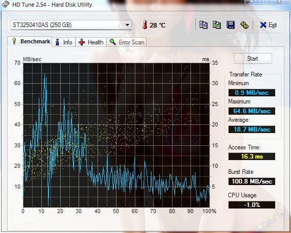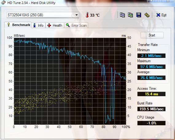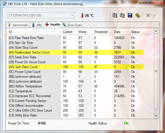 In den Screenshots seht ihr einmal einen Benchmark mit der betroffenen Platte, und einen von einer anderen Platte, gleiches Modell, funktioniert um einiges besser. Hab auch die SMART Werte ausm HDTune mal mit angehangen.