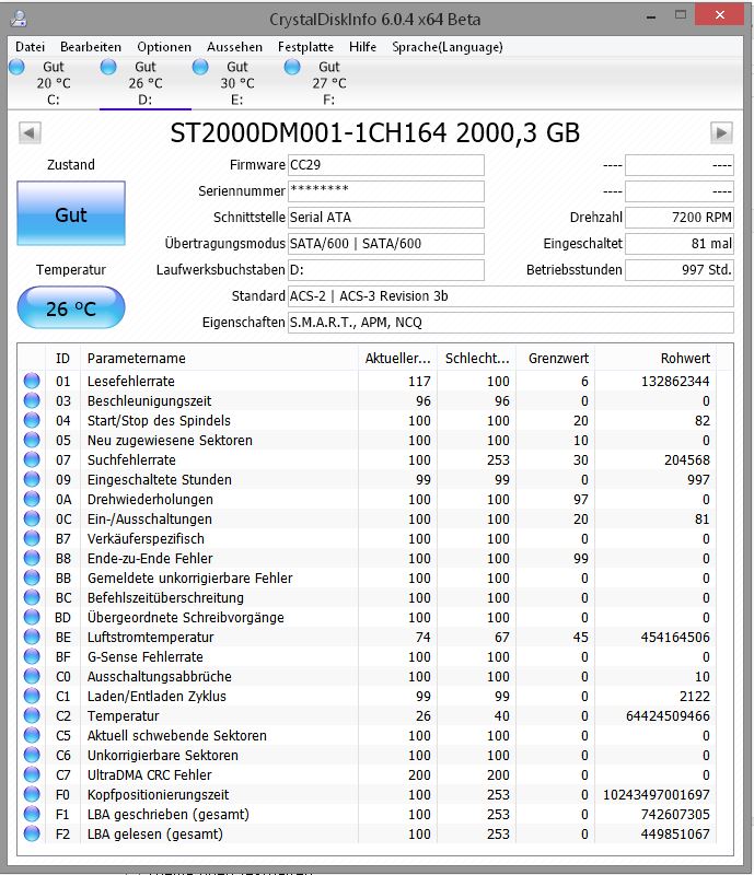 Leider habe ich mich vorab nicht vollends informiert und eine der Seagate ST2000DM001 Platten erwischt, die beim Parken so komische quiek Geräusche macht. Die Performance ist top und mit der sonstigen Lautstärke kann ich leben, aber das Geräusch kann einem ziemlich auf den Geist gehen und daher will ich sie nun tauschen. Auch das Firmware Update von Seagate hat das Problem nicht ganz behoben.