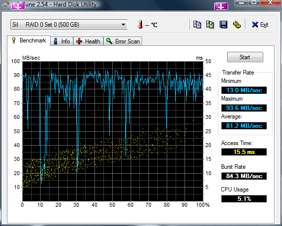 ich bräuchte da einmal eure Hülfe. Dieser Tread war unter anderem ausschlaggebend mir diese Seagates als Platten zuzulegen. Nun fein, laufen tun sie jedenfalls. Sie hängen als Raid 0 Verbund an einem Silicon Image Sil 3512 Sata Raid Controller (1,5 MBit/S ?). Leider entspricht das Ergebnis in keiner Weise meinen Vorstellungen. Ich hänge mal ein Bildchen von einem Benchmark an. Denke die Ergebnisse liegen in gleicher Nähe, wie wenn ich die Dinger einzeln am Laufen habe.