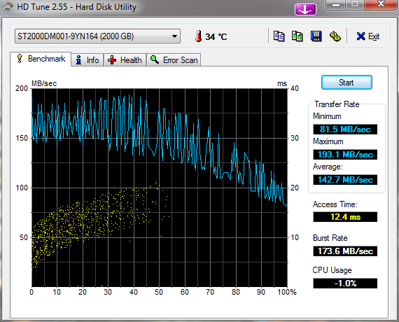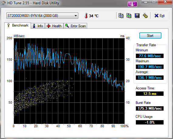 Hab mal die HDTune Messwerte rangehängt. Desweiteren ist die Platte angenehm kühl (30 °C ca.) und leise (fast keine Zugriffsgeräusche aus dem laufenden System hörbar).