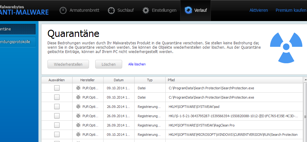 Du öffnest das Malwarebytes, gehst auf das Verlauf und schaust