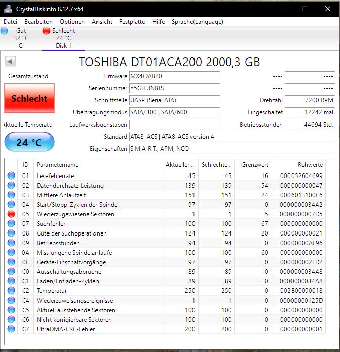 Ich habe eine alte 3,5" Sata HDD, ( Toshiba DT01ACA200) die über mehrere hundert wiederzugewiesene Sektoren hat, diese war eine ehem. Systemplatte, die gelöscht wurde und anschließend für Backups genutzt wurde.
