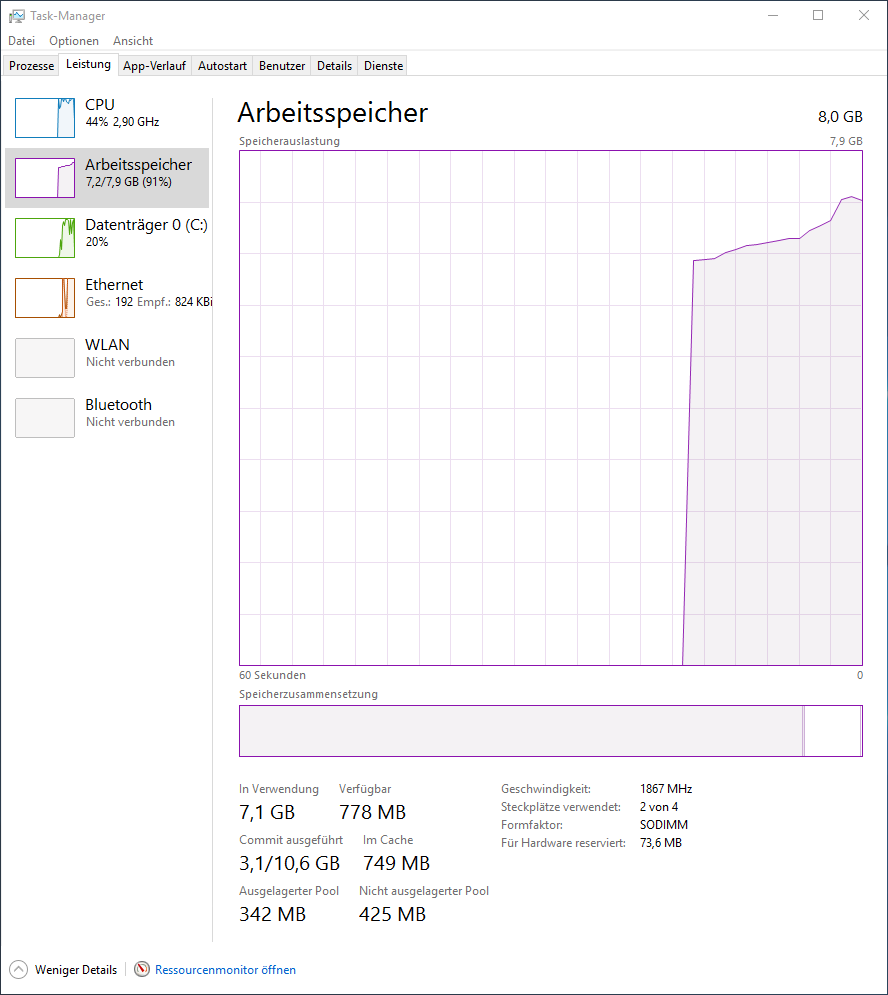 Windows 10 benötigt nach frischen Neustart direkt fast 8GB! Im agesicherten Modus verhält es sich normal.