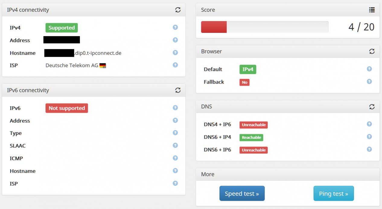- Manche Geräte im Heimnetz haben nur eine IPv4, manche nur eine IPv6, andere wiederum beides. Ob das am Client oder Netzwerk liegt, weiß ich nicht.