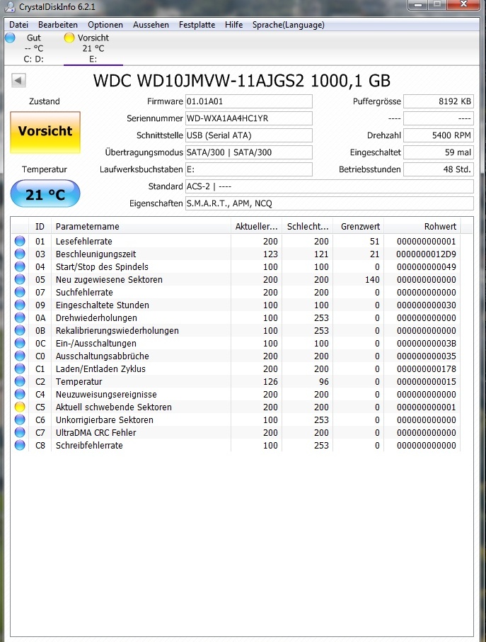 Hier die verrsprochene Variation: Es folgt ein Screenshot von CrystalDiskInfo (was kann man sonst noch aus diesem herauslesen? Was ist mit den schwebenden Sektoren zu tun außer Chkdsk?):