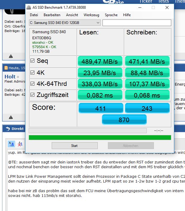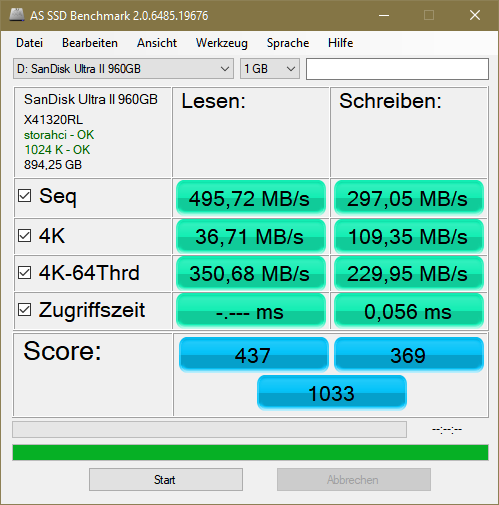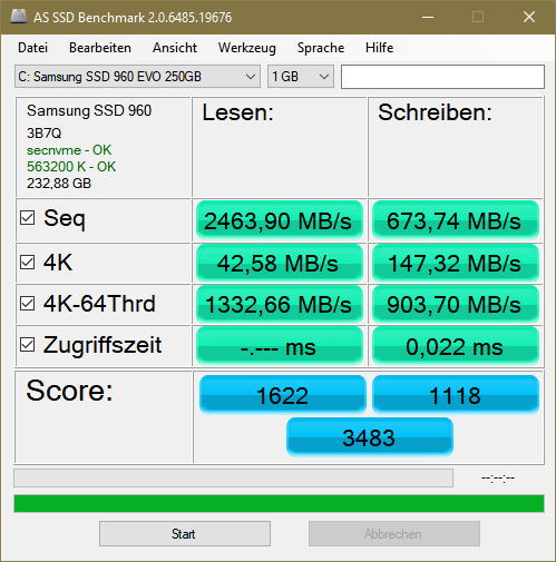AS SSD Benchmark und Crystal Disk Mark bestätigten mir nun was los ist.