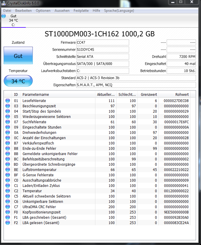 Poste bitte mal den Screen von CrystalDiskInfo, ziehe aber bitte das Fenster soweit auf, dass alle Attribute und auch die Rohwerte vollständig sichtbar sind.