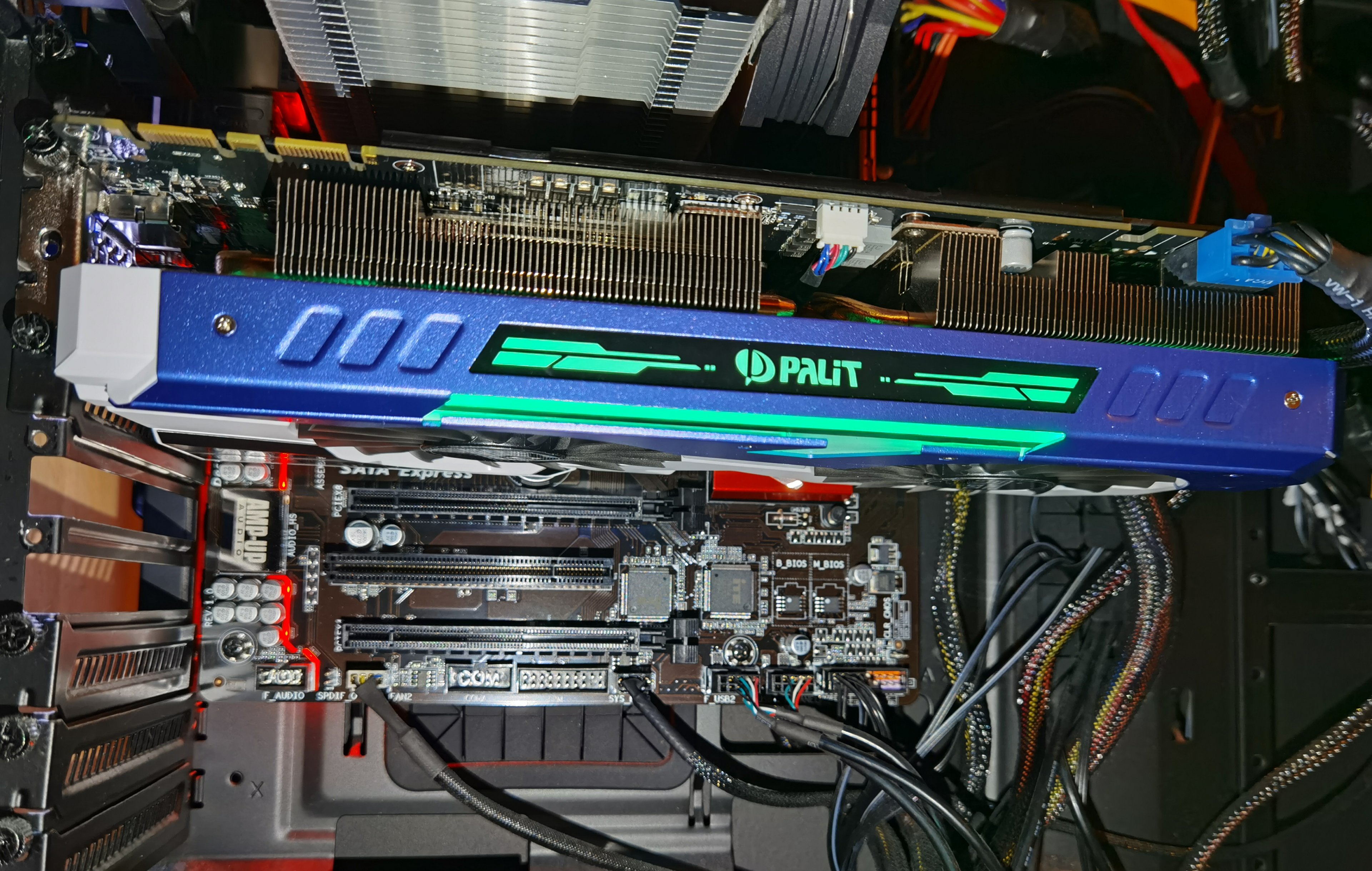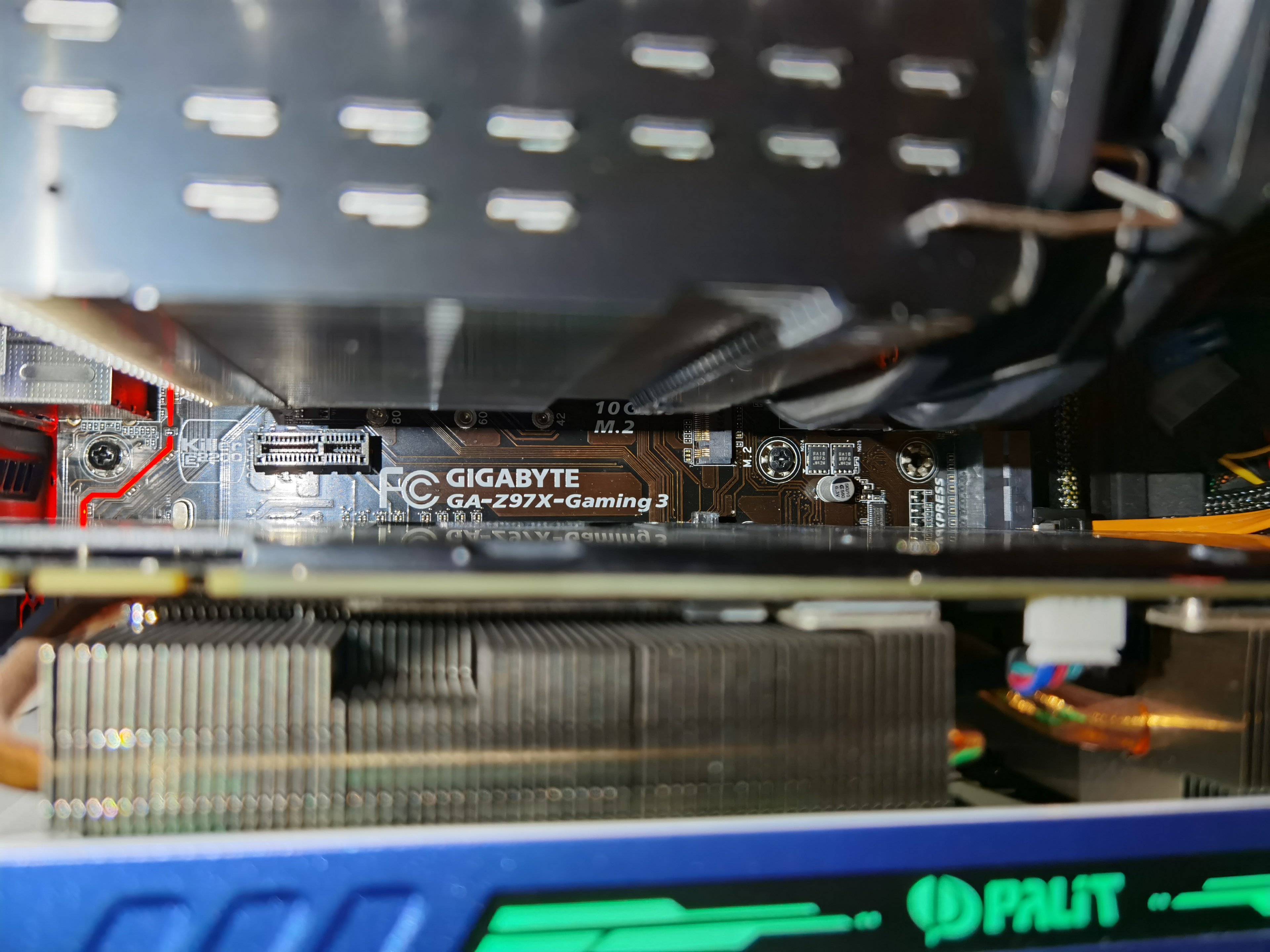 Die Grafikkarte nimmt komplett zwei Slots weg. Also bei x16 angeschlossen sind die unteren slots für die soundkarte gesperrt. Der ganz obige slot geht leider auch nicht für die soundkarte weil der Soundblaster einen Kühlkörper hat der dann mit der Graka kollidiert.
