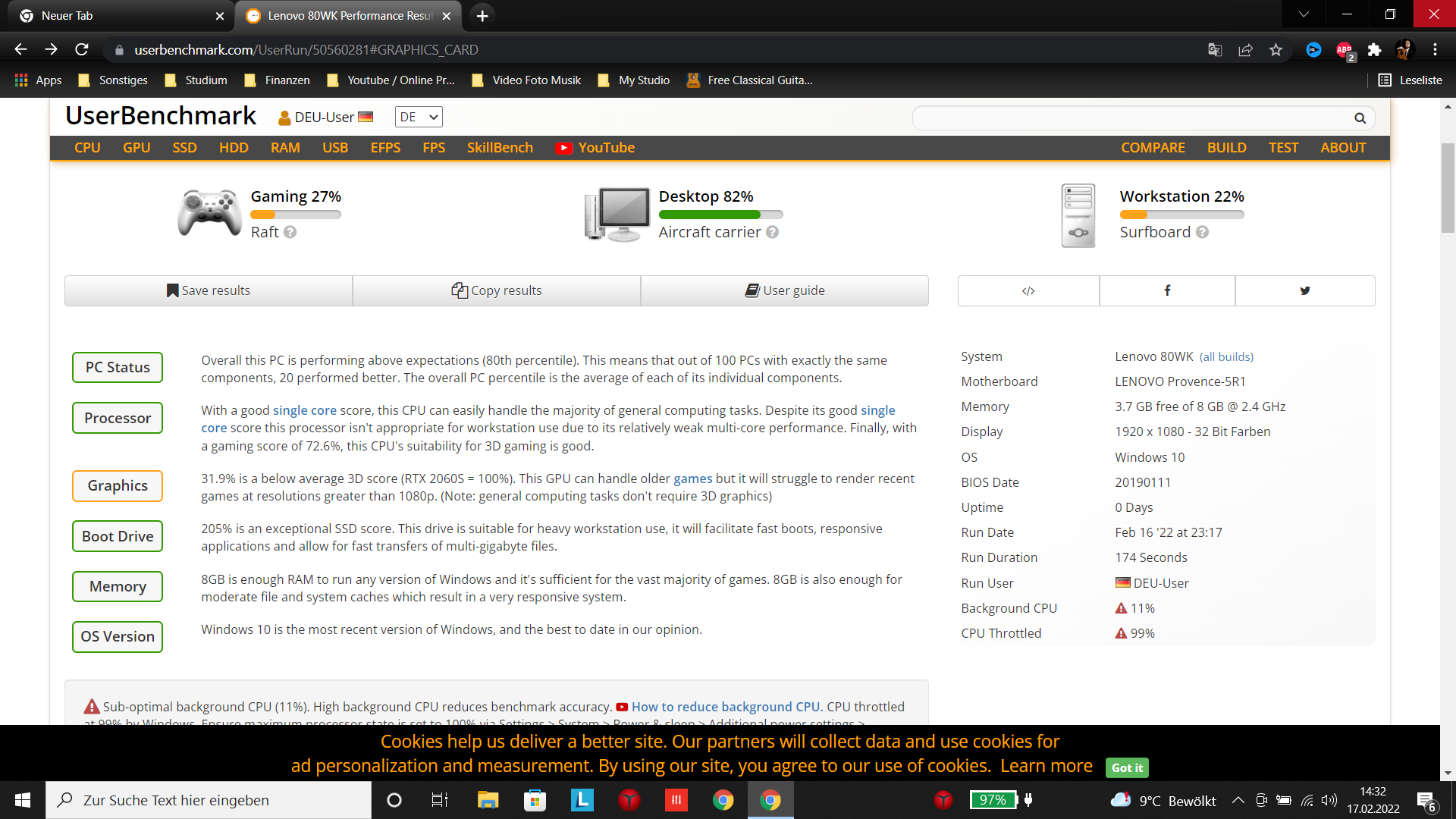 Ich habe einen Benchmark gemacht und Infos während des Spiel mit Afterburner anzeigen lassen und hänge die jeweiligen Screenshot hier mit an. Außerdem habe ich die Leistung auf ultimative Leistung gestellt und der Laptop steckt in der Steckdose. Außerdem habe ich die bevorzugte GPU-Auswahl auf die GTX 1050Ti gestellt. Ich bitte um Hilfe!