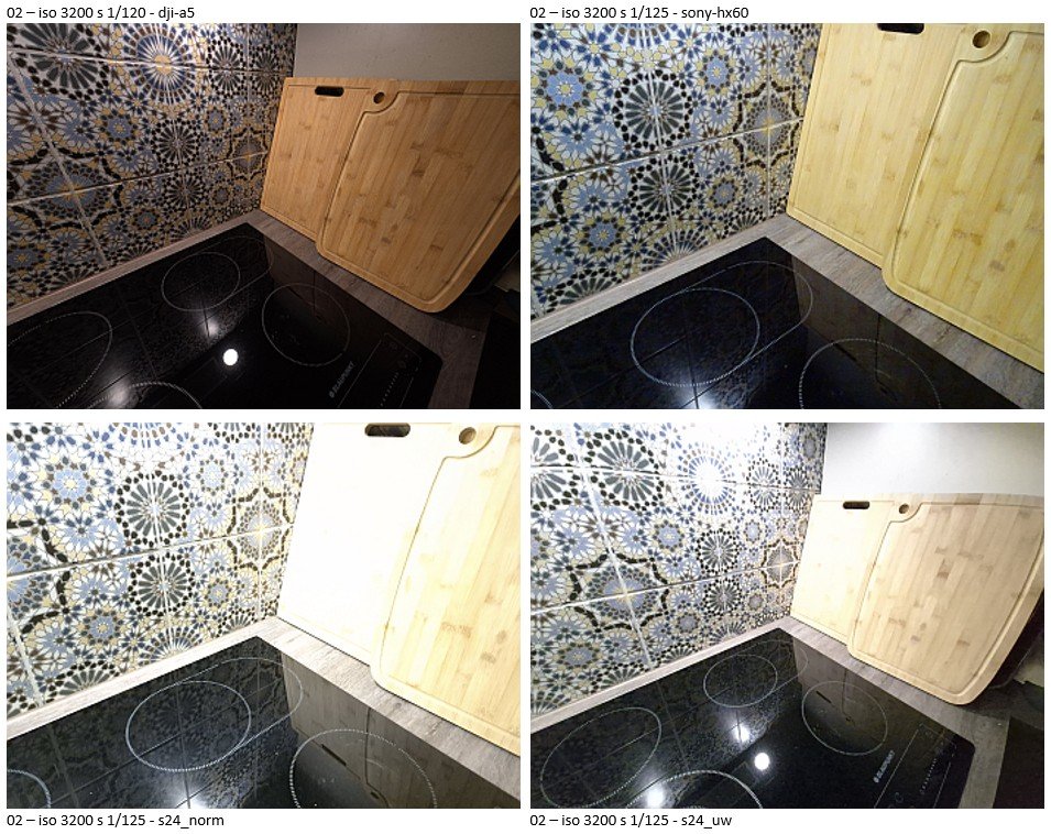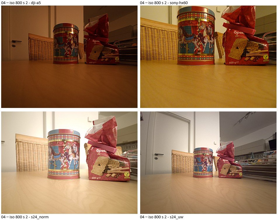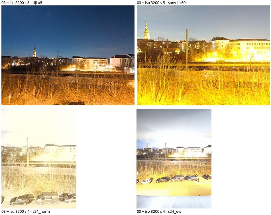 Technisch gesehen bzw. von der Größe des Sensors her sollte die DJI eigentlich vorn liegen, aber sie liegt immer deutlich auf dem letzten Platz. Im Anhang ein paar Bilder im Direktvergleich. Man sieht deutlich, dass die DJI immer massiv dunkler ist als alle anderen Kameras. Sprich: sie holt einfach mit Abstand das wenigste Licht raus, obwohl sie den größten Sensor hat.