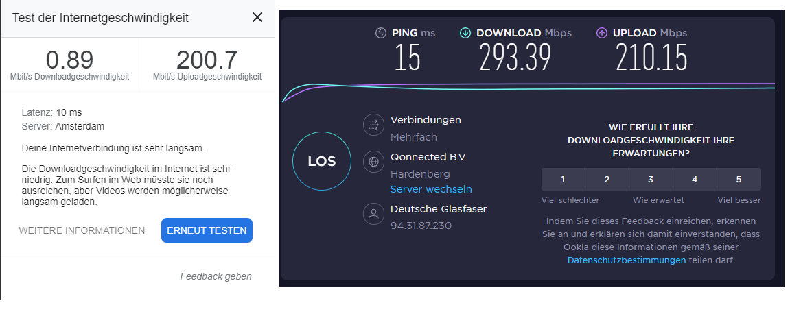 Irgendwann Nachts geht es dann wieder mit normaler Geschwindigkeit (400/200). Proivder ist die Deutsche Glasfaser und ich wohne nördlich von Essen/südlich von Münster.