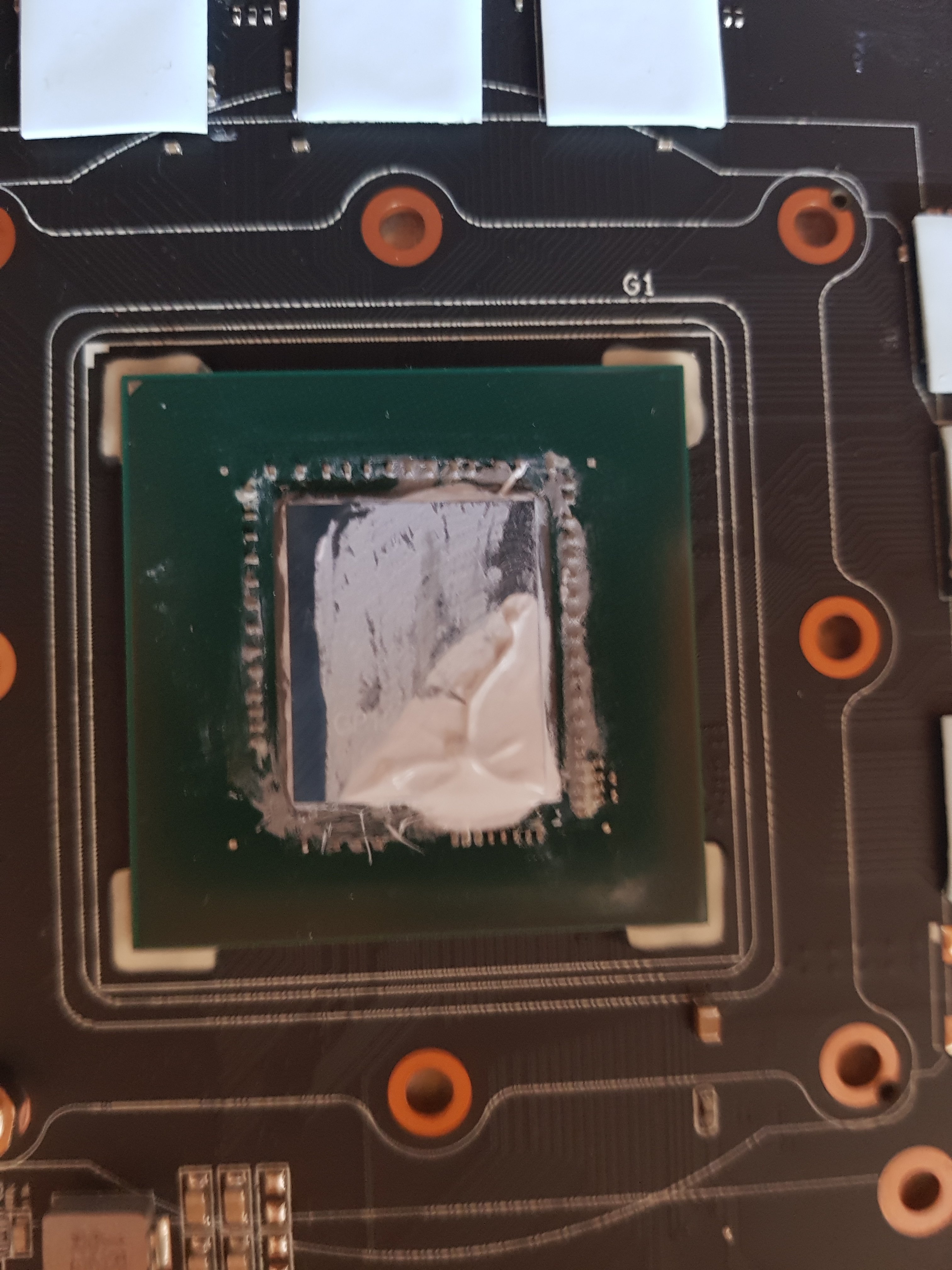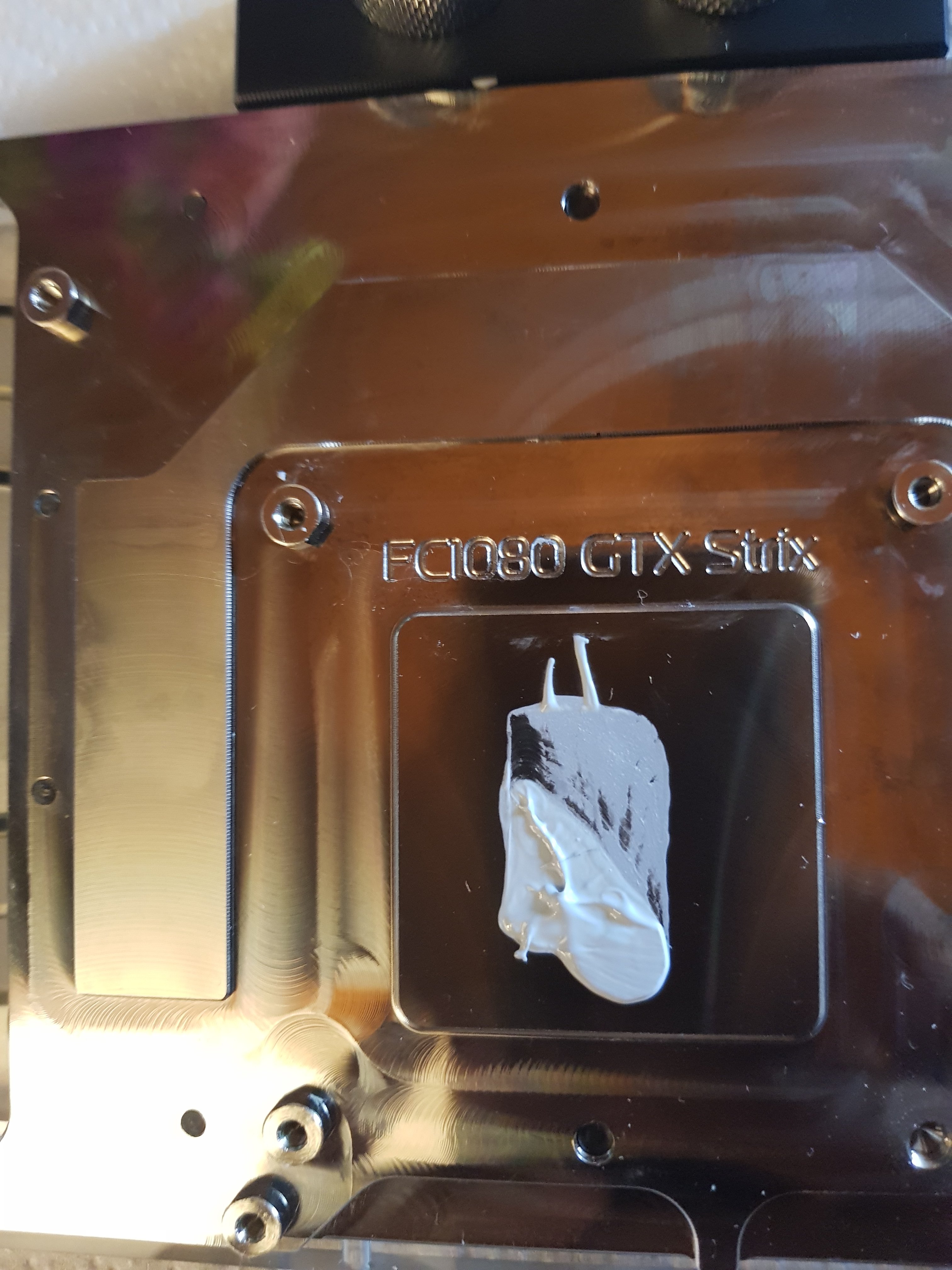 Wie ich sehe hast Du auch die 4 Heißklebe Streifen an den Ecken des GPU Kerns. Gab's da nicht Probleme mit und EK hat empfohlen, die 4 Abstandshalter am Block zu entfernen? Ich kuck nochmal nach...
