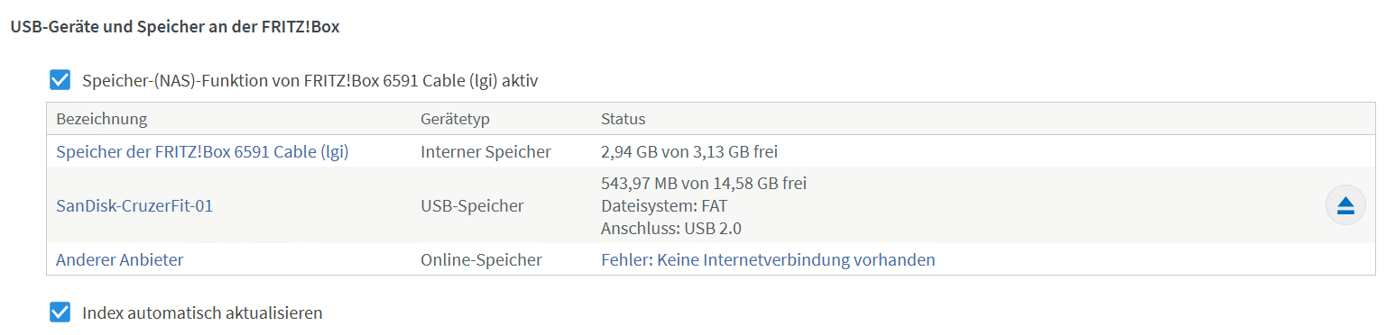 Die Fritz-Box wird mir aber nicht mehr im Fernseher angezeigt, so dass ich keinen Zugriff mehr auf den USB-Stick habe, der an der Fritz-Box angeschlossen ist. In der Fritz-Box wird mir der Stick angezeigt: