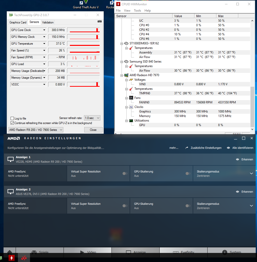 hab 2 Monitore, den einen an meiner 7970 und den anderen an der IGPU vom 3570K, da wenn ich beide an meiner 7970 hänge die Karte hochtaktet und die Idle Spannung erhöht wird. So war es vor 2 Jahren mit Catalyst, hab gerade aus Spaß beide Monitore an meiner Karte gehängt und ich kann meinen Augen garnicht glauben