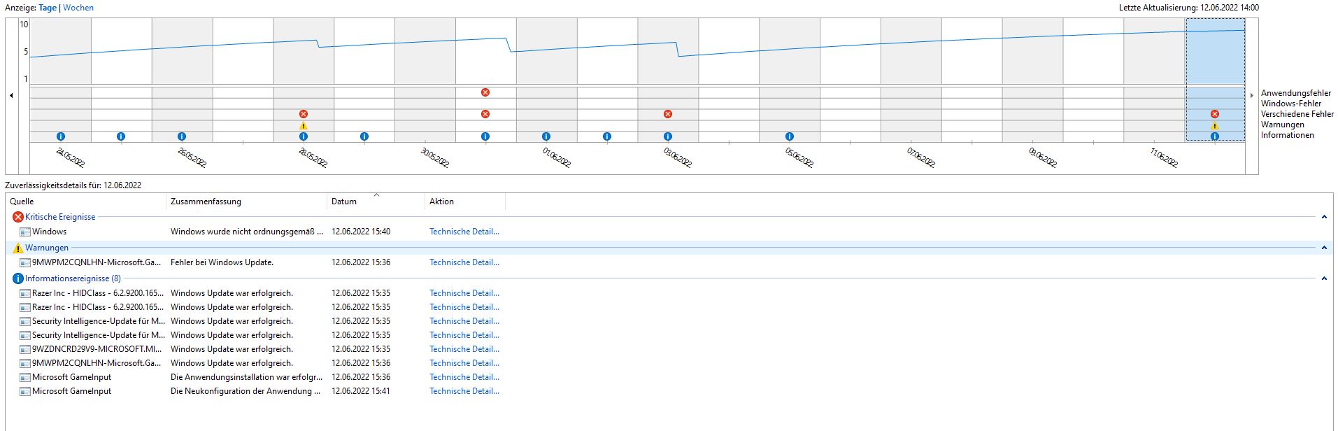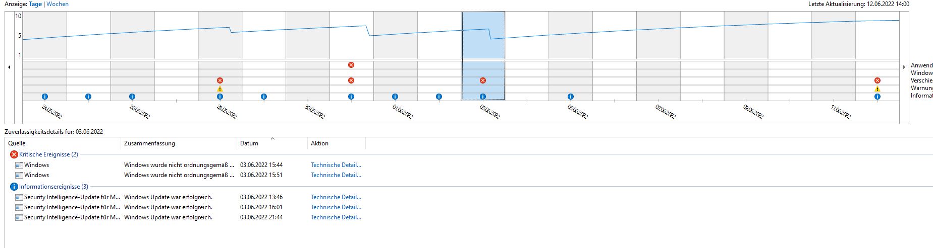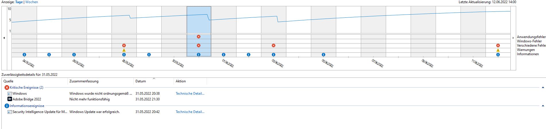 In der Zuverlässigkeitsüberwachung ergibt sich mir folgendes Bild an den Absturztagen.