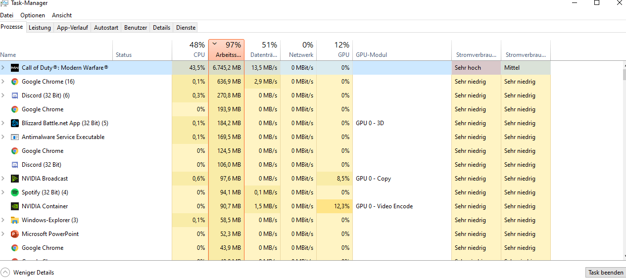 Seit dem letzten Update habe ich krasse fps drops in Warzone, was höchstwahrscheinlich vom vollen RAM kommt. Meine Lösung gestern Abend war, alle Hintergrundapps schließen, von 1440p auf 1080p runtergehen und Vollbildmodus. Spiele sonst Vollbild rahmenlos. Habt ihr bessere Lösungen? Weil mein PC war vorher auch locker zu Multitasking in der Lage und ich habe nun das erste Mal seit einem Jahr Warzone fps drops...