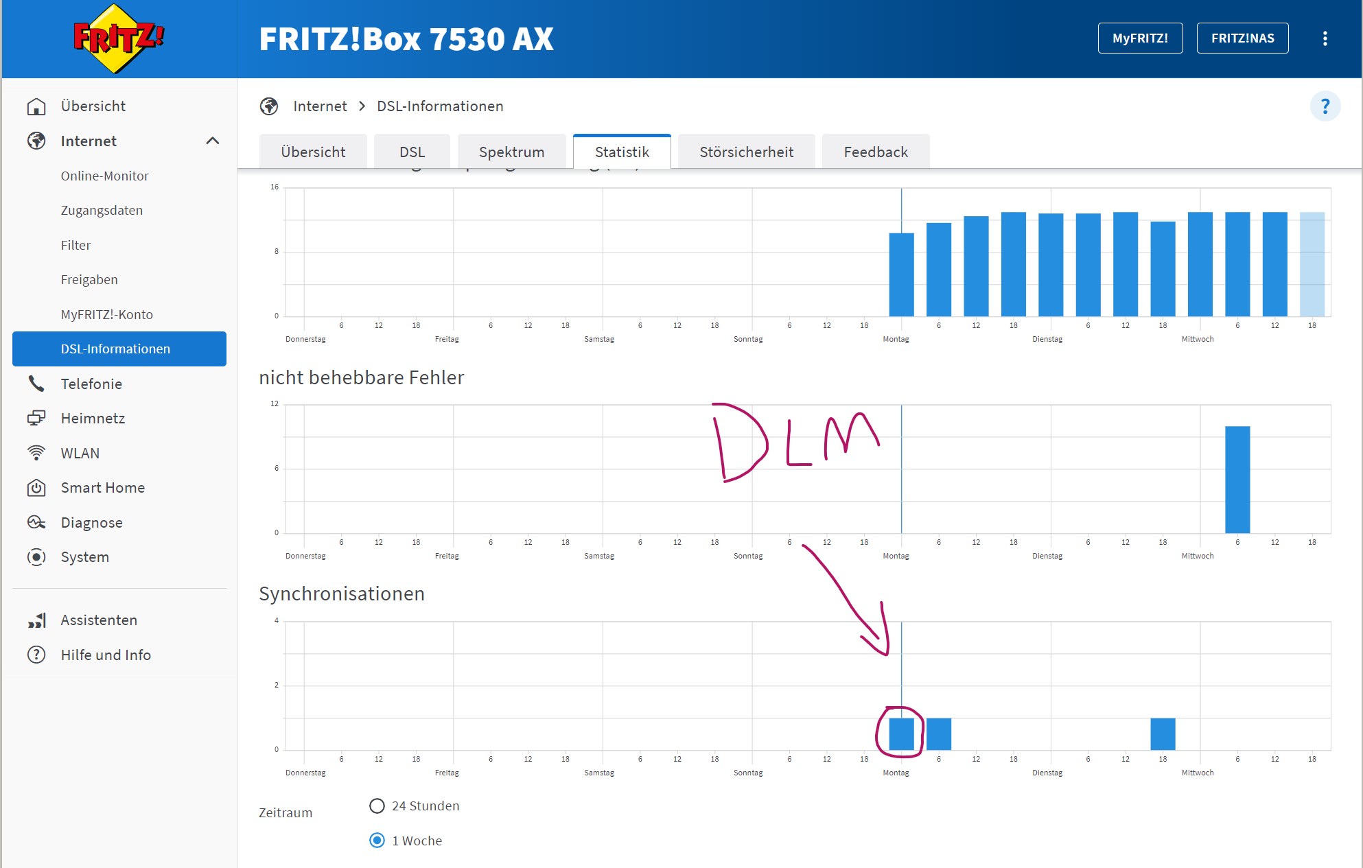 der resync am Montag ist DLM geschuldet wegen den resyncs, ich hatte zwischenzeitlich auch mal die fritzbox zurückgesetzt deswegen sind so wenig resyncs zu sehen