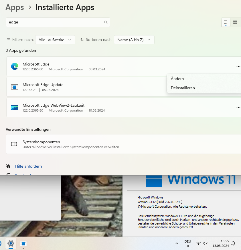 nachdem neustart war im startmenü beim edge die zeile deinstallieren sichtbar, draufgeklickt-> einstellungen apps hat sich geöffnet, dort dann auch edge ausgewählt und das ist deinstallieren ist ausgegraut, danach auch ist das deinstallieren im startmenü auch wieder weg. strangenobby_a schrieb:Du kannst es mit dem ViVeTool versuchen, jedenfalls klappte das bei mir unter Windows 11.