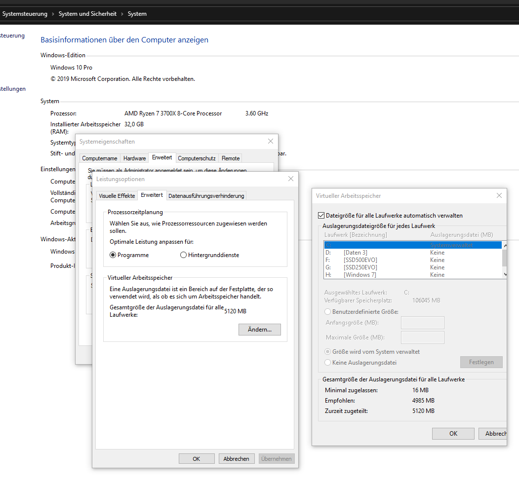 Vor dem Upgrade habe ich mit dem Rechner hunderte Stunden in Spiele investiert, da gab es also keine Probleme. Direkt danach kann ich mich auch nicht an Probleme erinnern, es scheint erst seit ein paar Wochen aufzutreten. Wobei ich bis jetzt noch keinen Freeze oder Absturz des gesamten System gehabt habe (dann könnte der RAM eins weg haben), sondern nur einzelne Programme, welche abstürzen oder eben die "Out of memory" Meldung bringen. Heute hatte ich es z.B. mit Lightroom. Virtueller RAM liegt bei 12GB.