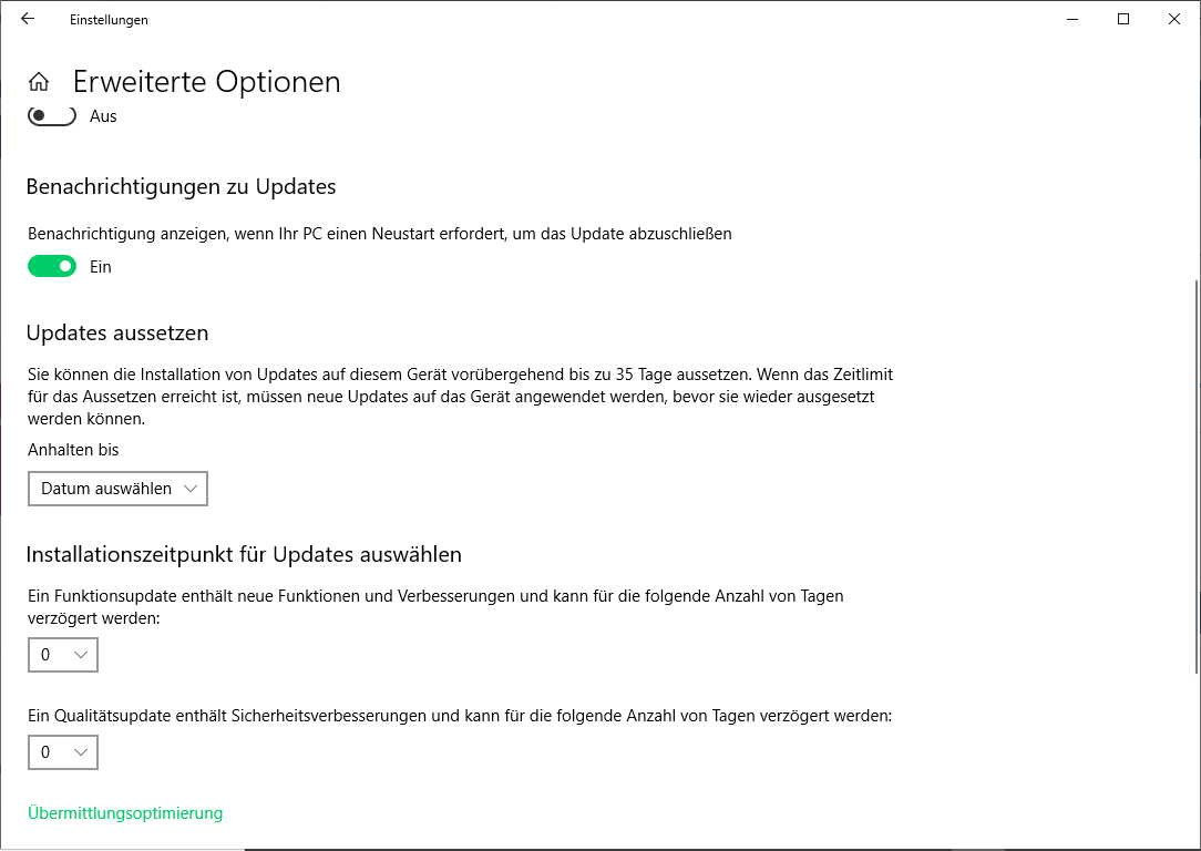 Verzögern bedeutet(e) bei mir in der 1803 und 1809 auch "komplett" verzögern. Da kamen auch nach manueller Update Suche keine Funktions- und Qualitäts Updates mehr rein, wenn man da eine Zeit vorgegeben hatte. Erst, wenn man wenn man das wieder rückgängig machte, fand Windows (auch manuell) erst wieder Updates.