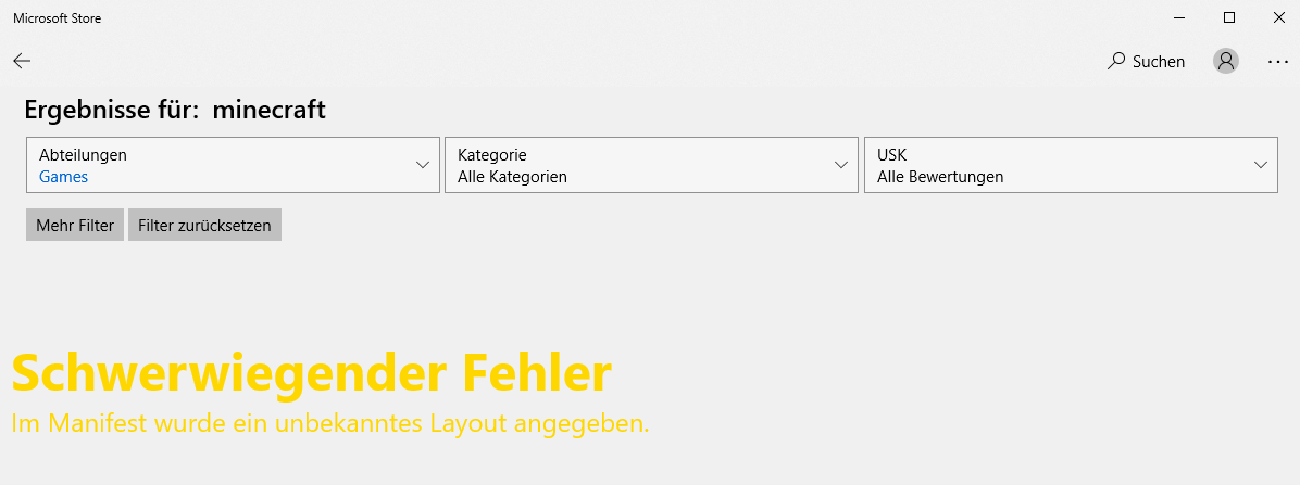 @ARNOFPS: Schade. :-( Leider immer noch keine Verbindung zu Windows Update. Testweise mal den Store bemüht und dort kann ich mich zwar ein bisschen durch den Store klicken und auch die Suche funktioniert. Gehe ich z.B. bei Spielen aber auf "Alle anzeigen", poppt der Kollege im Anhang auf.