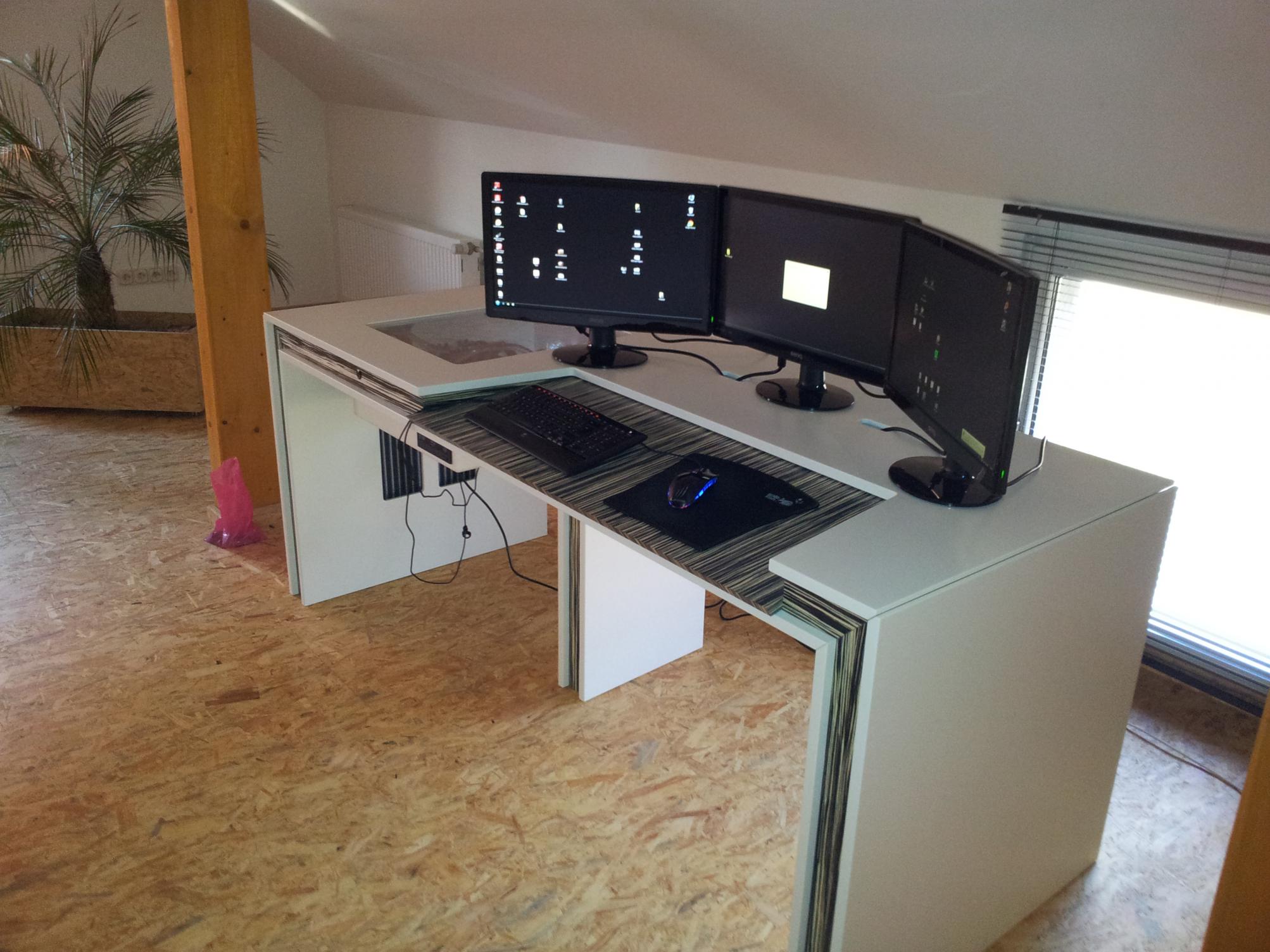 Sehr geil. Hätte aber bei dem Aufwand gleich noch drei gescheite Monitorhalterungen integriert und die Standardfüße entfernt. Finde außerdem das das viele Schwarz der Klavierlackmonitore nicht so gut zum weißen Schreibtisch passt.