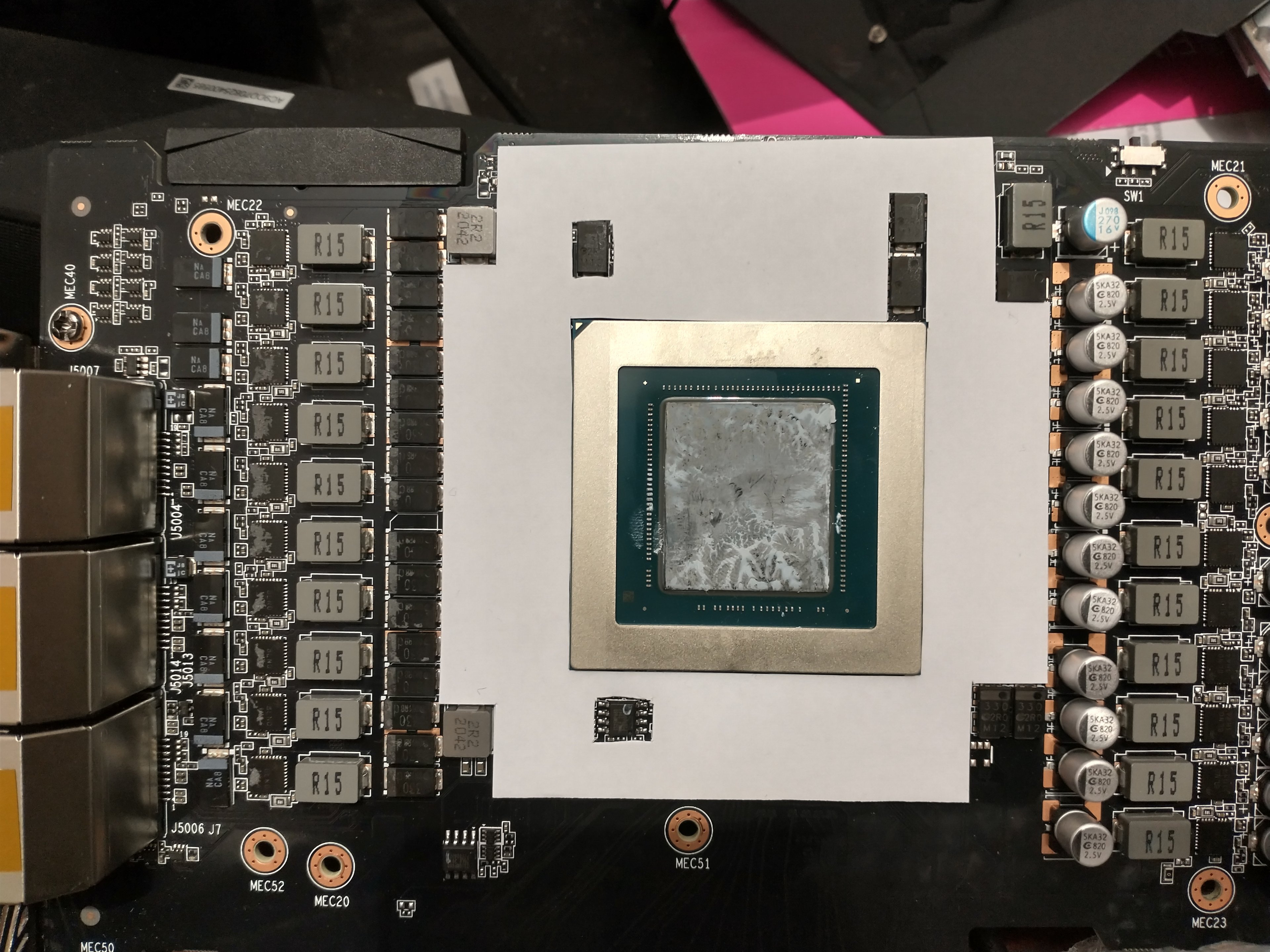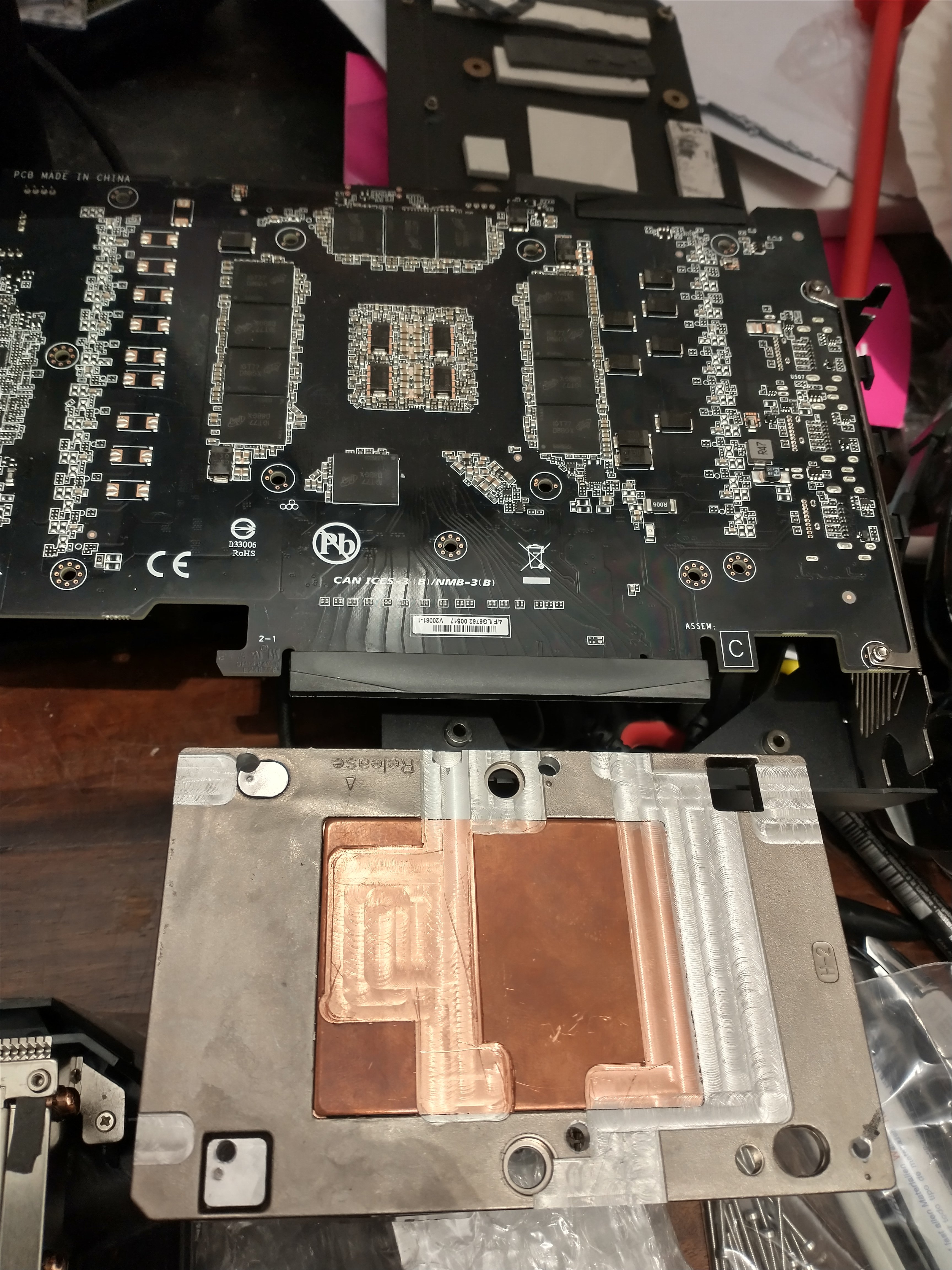 Hallo! Da die Kühlung der Rückseite meiner 3090 nicht ausreichend ist, habe ich einen eigenen Backplate-cooler gebaut. Er besteht aus einem Server-cooler. Ich habe Einschnitte dort gefräst, wo es Bauelemente gibt, die höher sind als RAM Chips. Der Cooler wird den RAM, die GPU Caps, die Rückseite des GPU, und die Rückseite des VRM auf der rechten Seite kühlen. Der VRM auf der linken Seite wird von einem separaten Cooler gekühlt.