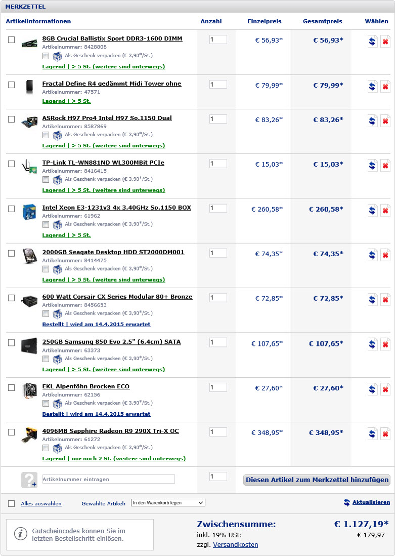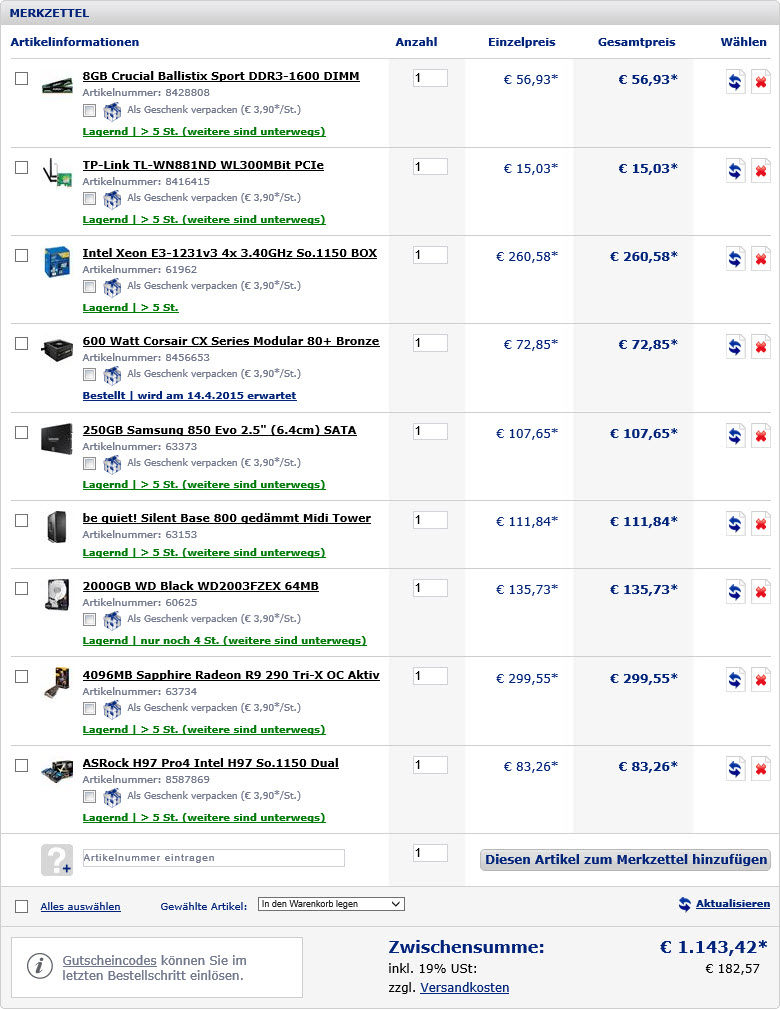 Alle Artikel habe ich mir auf http://www.hardwareversand.de/ zusammen gestellt und kam auf einen Endpreis von 1150€. Tipps wo man noch etwas mehr zahlen sollte oder etwas einsparen kann wüden mich freuen. Desweiter Kommentare zu den Komponenten und deren Kompatibilität sind erwünscht!