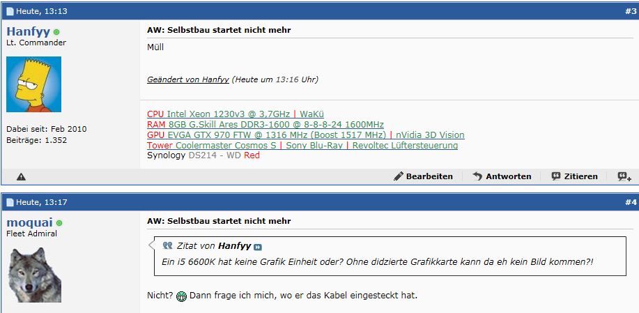 ich sitze gerade an meinem ersten rechner und habe ein kleines Problem: Er startet nicht (mehr). Hab alles angeschlossen und dann mal nen Probestart versucht. Daraufhin ging er für ein paar Sekunden an, das Mainboard leuchtete und der CPU Fan fing an zu drehen. Das dauerte so 3-5 Sekunden. Danach ging er wieder aus und startete dann wieder neu. Das ging dann so weiter...