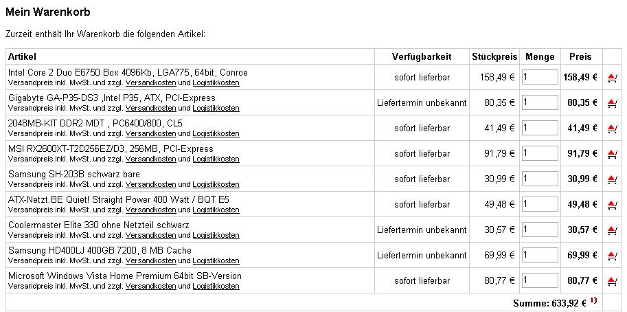 MediaMarkt hat jetzt einen PC im Angebot für 600 €, Intel Core 2 Quad 6600 Prozessor 2,4 GHZ, ATI Radeon HD2400 Pro, 360 GB S-ATA HDD, 1024 MB DDR 2 Ram, DVD Brenner und Windows Vista mit eingeschlossen. Den Ram würde ich da nochmal um 1 Gig aufstocken.