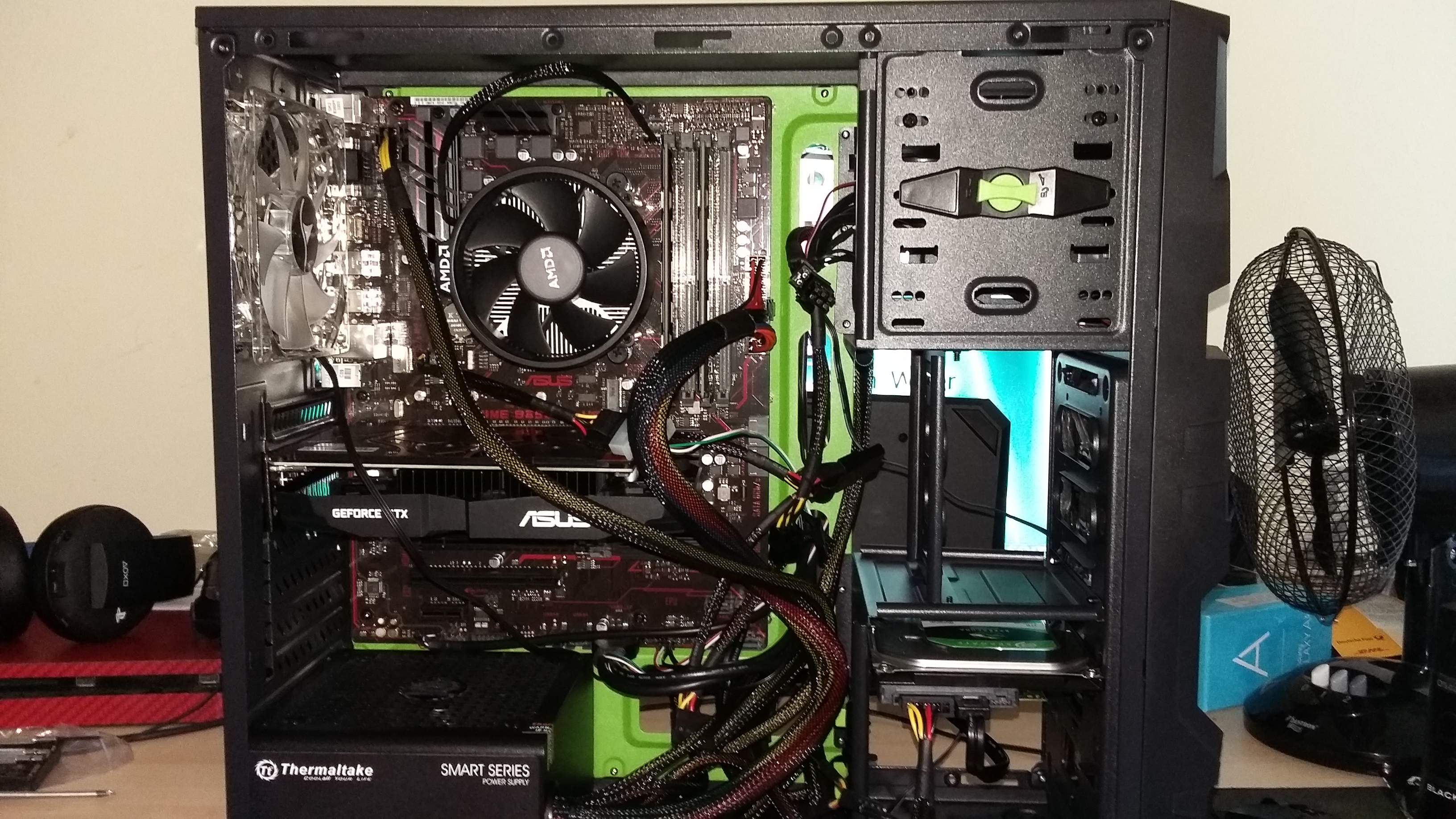 Das Netzteil ist ein RGB Thermaltake mit 600 W, bei welchem sich beim anschalten weder der Lüfter bewegt, noch die Beleuchtung anspringt.