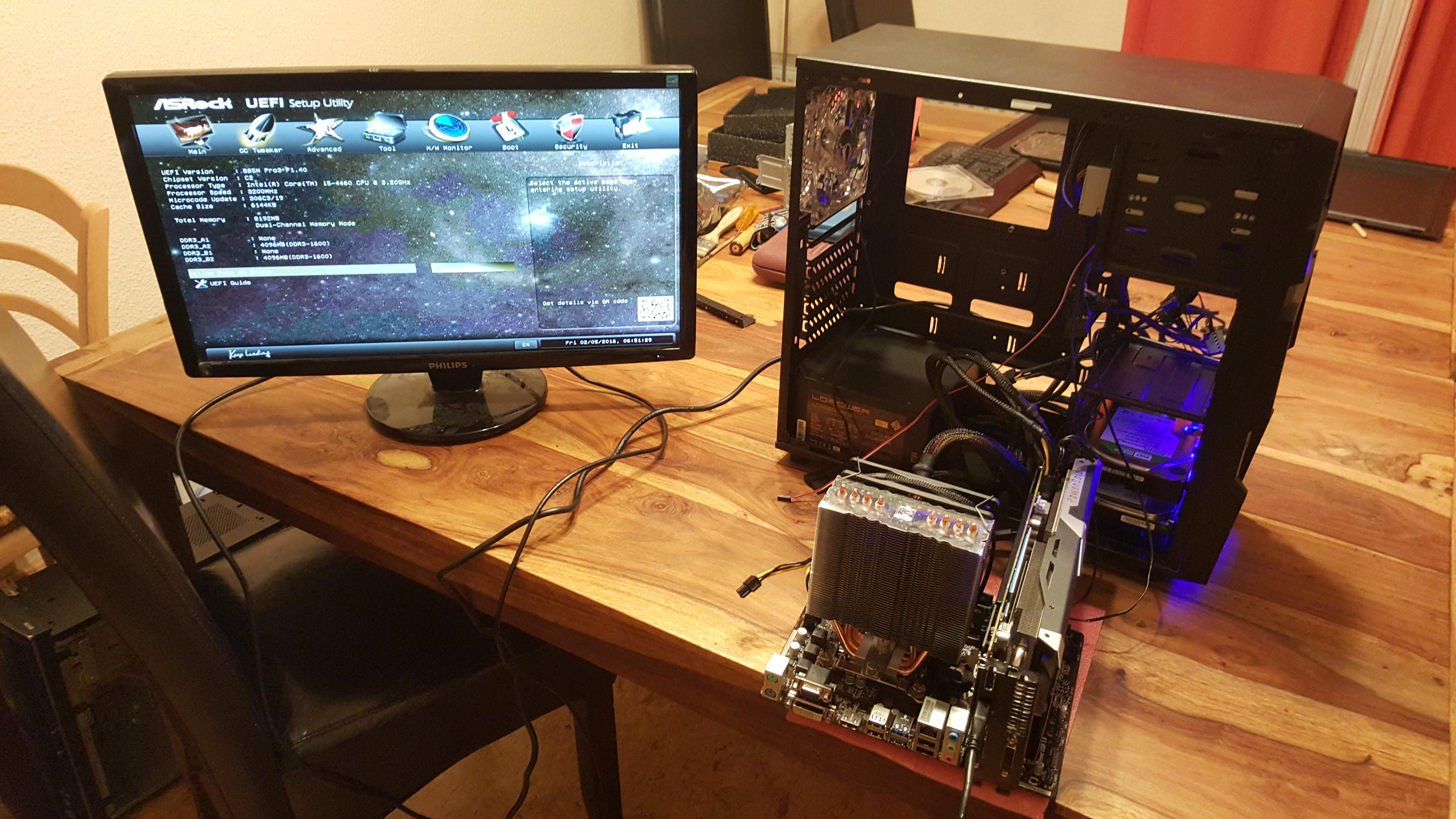 2. Mir wird kein Bild angezeigt. Ich habe bisher nur HDMI getestet, da ich weder DVI noch VGA Kabel zur Hand hab. Ich denke aber, dass das auch mit HDMI von Anfang gehen sollte oder? Der Bildschirm ist auf HDMI eingestellt und ich habe sowohl den Mainboard- als auch den GPU-Ausgang getestet.