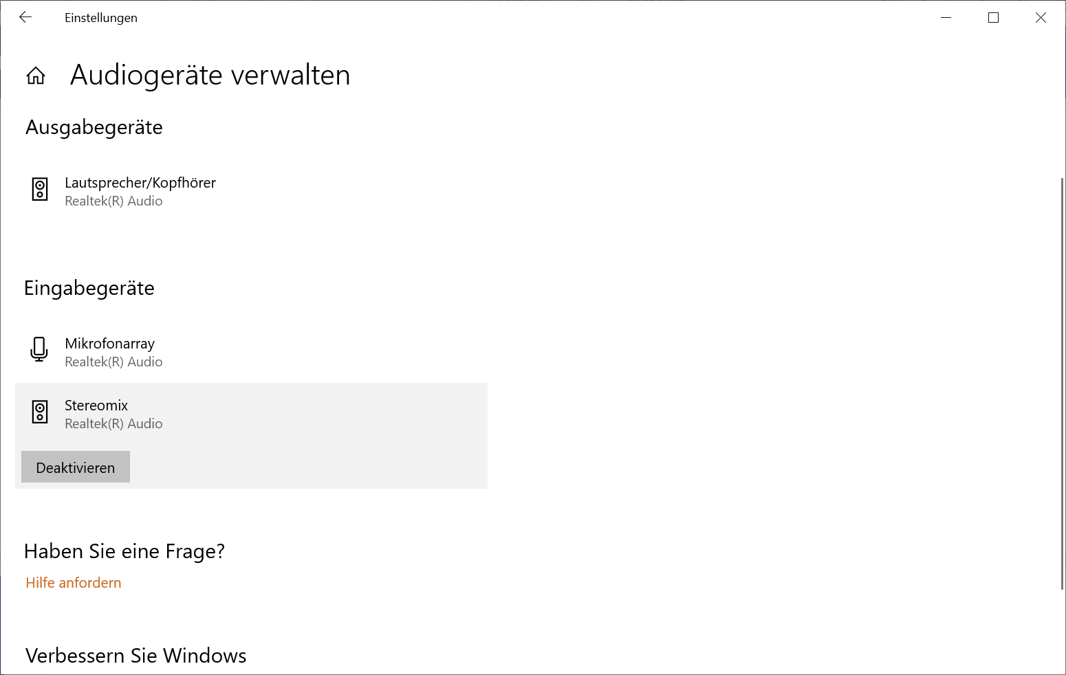 Diese Updates sorgen dann dafür, dass du den STEREOMIX des Realtek nicht mehr nutzen kannst. Standardmäßig ist der Stereomix bei Installation immer deaktiviert. Sobald du dann den Stereomix über die Windows Einstellungen > Sound > Audiogeräte verwalten >