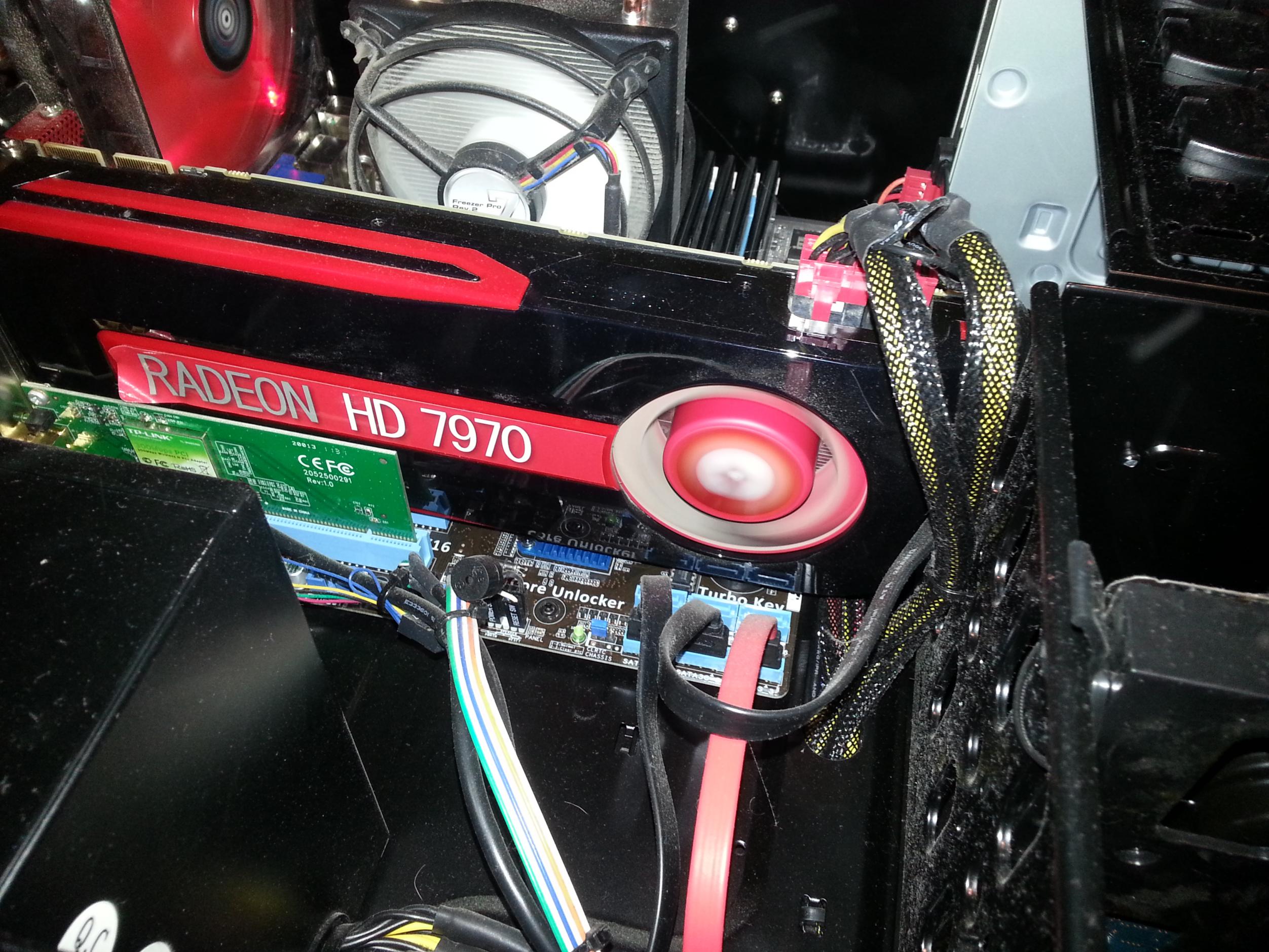Neuer CPU Kühler würde Abhilfe schaffen, aber bitte dann einer, wo der Lüfter in die andere Richtung montiert wird. So eine HD7970 kann richtig schön warm werden. Kein Wunder dass die CPU dann überhitzt, wenn sie die warme Luft ansaugt. Schau auch nochmal nach, ob an der Vorderseite ein Lüfter montiert ist.