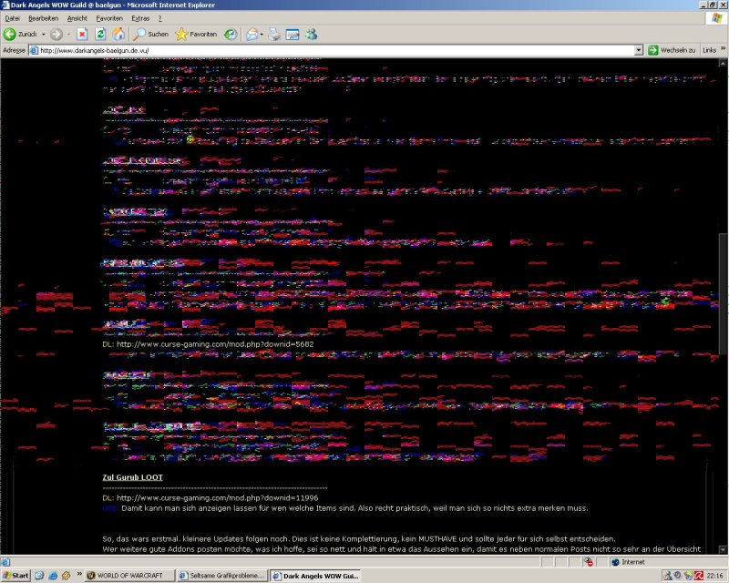 Auf unserer Gildenseite www.darkangels-baelgun.de.vu habe ich oftmals das Problem, also eigentlich fast immer, das wenn ich schnell Scrolle, es evtl. ein Bild oder so noch geladen wird, Ich die halbe Seite mit nem großen Bug habe. Der Text wird total "zerrissen", bunte Farben erscheinen und wenn ich nicht schnell wegscrolle oder den Browser schliesse, hängt der PC total! Ein kompletter Neustart ist nötig *kotz*