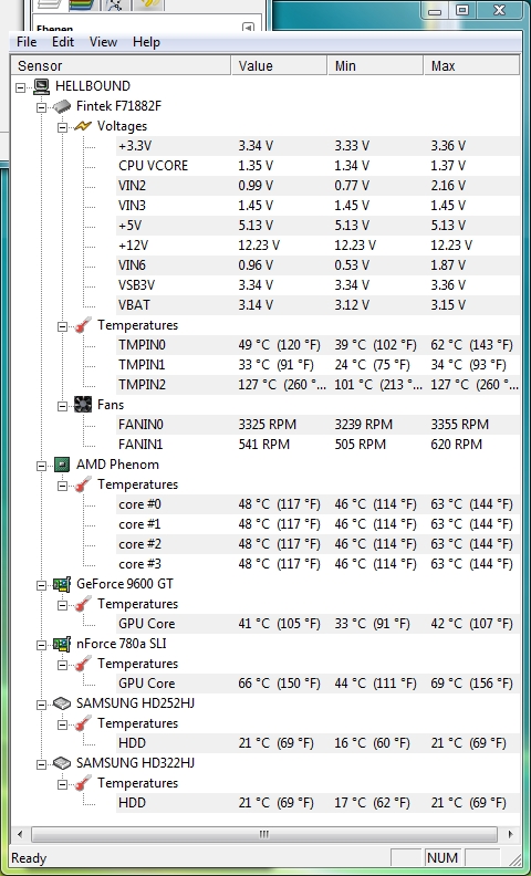 Also tmpin2 bzw Temp 3 bei Speedfan geht bei mir unter Last auch schlagartig nachoben , Everest hat sich den Sensor als "Cpu" geschnapt und liess mich am anfang auch sehr bibbern. Unter last 20 min Prime dann schon bei 65 °C steigend und die Kerne schlummerten gemütlich bei ~38°C. HWM und Speedfan geben bei mir wohl den ersten Sensor 1 bzw tmpin0 als Cpu.