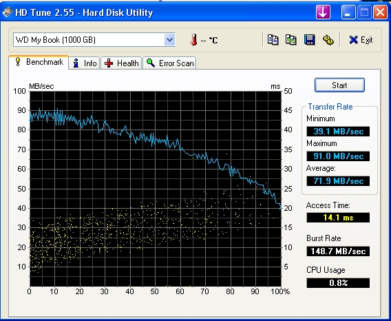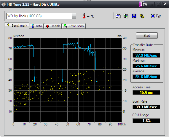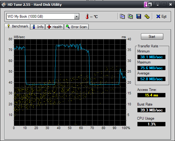 ich hab seit einiger Zeit ein externes Datengrab: Eine Western Digital My Book Home Edition 1 TB, per eSATA angeschlossen. Die Platte ist an dem internen Controller meines P35 angeschlossen, der auf IDE konfiguriert ist. OS ist WinXP Pro SP3 32 Bit. Soweit so gut. Vor einiger Zeit hab ich mal aus Spaß einen Benchmark mit HD Tune gemacht.