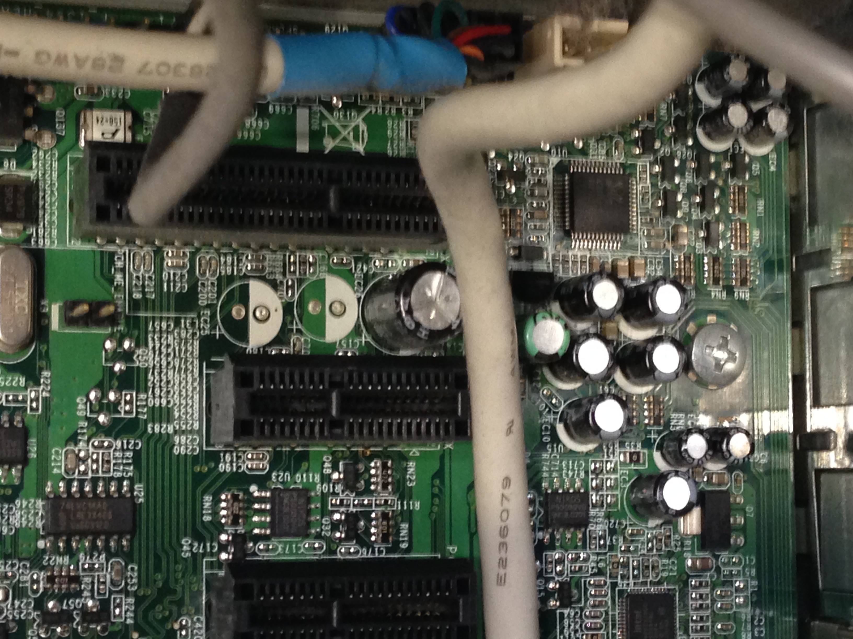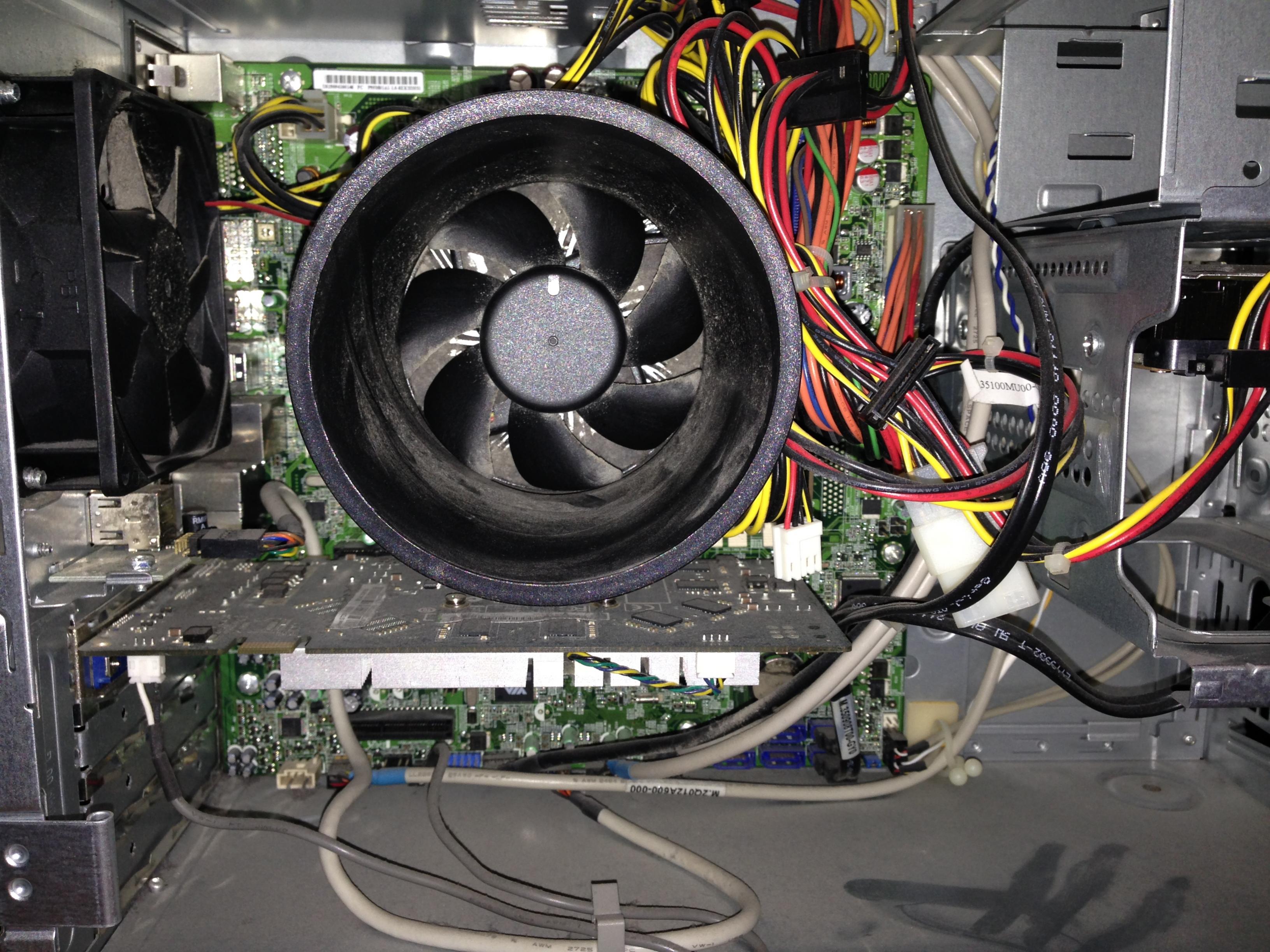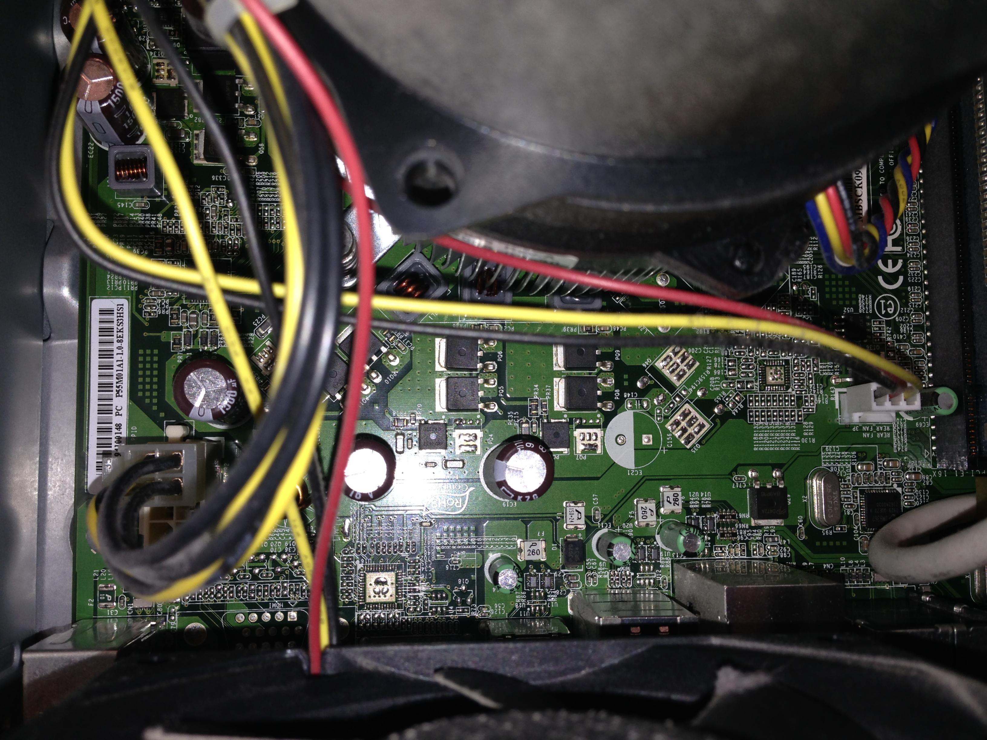 Er scheint also die ganze Zeit hochfahren zu wollen. Das erkenne ich daran, dass die Laufwerke (?!) anfangen kurz Geräusche zu machen, wie früher beim Neustart. Aber er bleibt stecken. Nun sitze ich gerade vor dem Rechner (Gehäusedeckel habe ich aufgemacht).Die Lüfter drehen sich, hören auf zu drehen, fangen wieder an zu drehen usw.