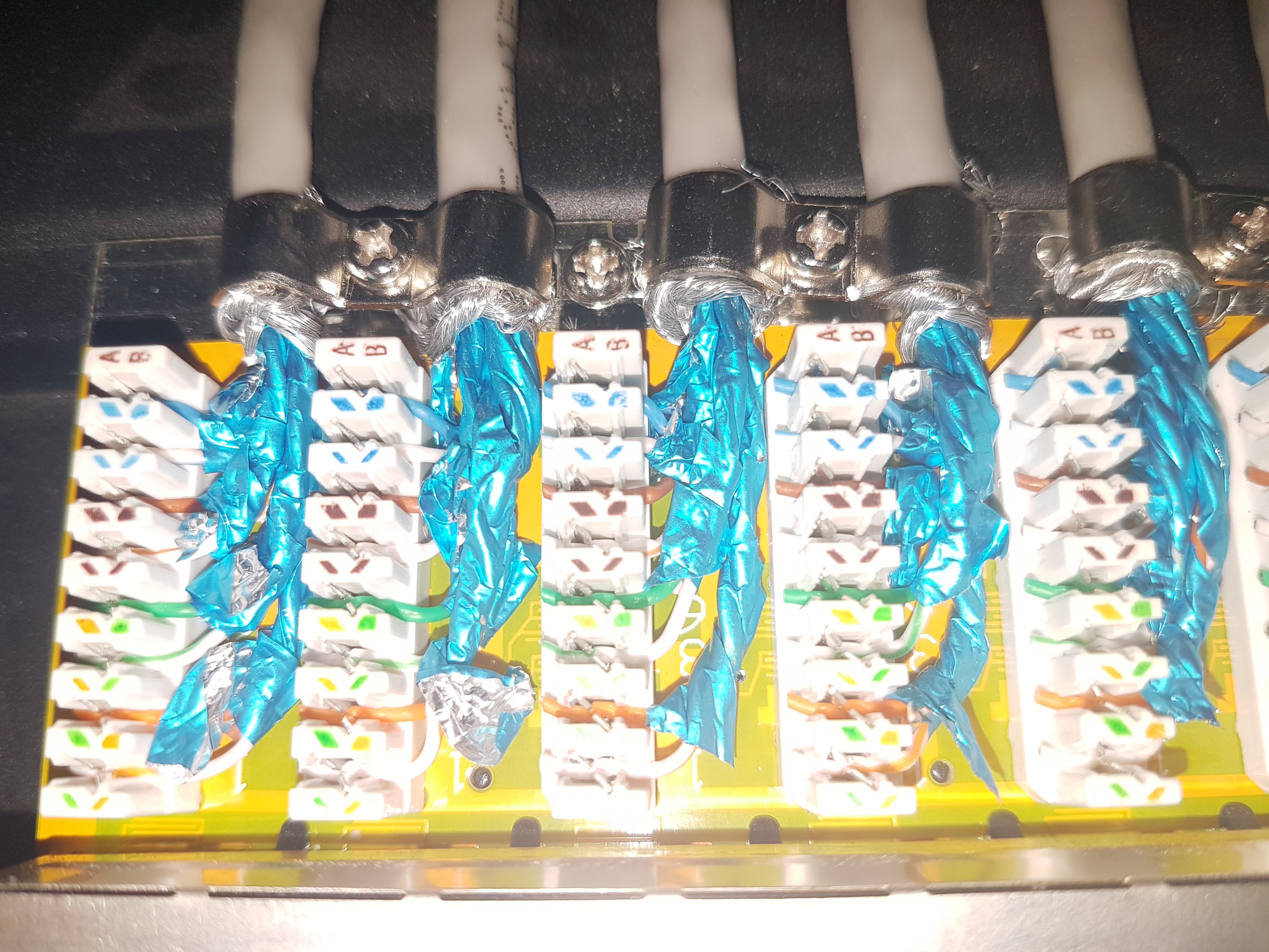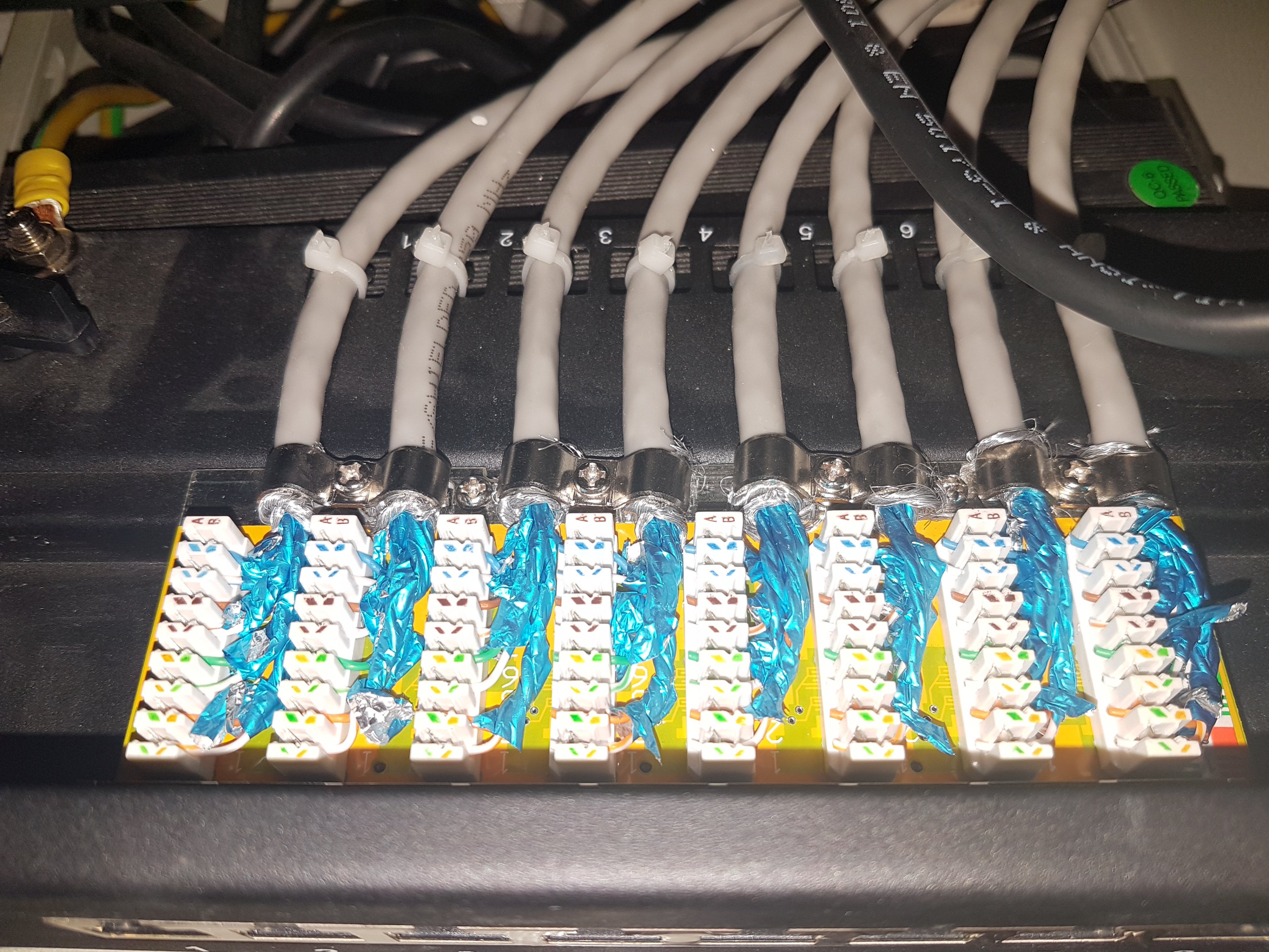 Auf dem Bild habe ich zur besseren Übersicht nur das funktionierende 0,25m Patchkabel für Nr.1 an Port 1 angeschlossen, sowie das Internetsignal zum Switch und die beiden Telefonanschlüsse. Ich hatte bereits auch einmal die Stromversorgung aus dem Schrank genommen um eine mögliche Störung zu verhindern, aber es ändert nichts daran. Alle Geräte wurden innerhalb und wo es möglich war per sternförmiger Erdung zusammengeführt und nach außen an ein Heizungsrohr verbunden - in Summe allerdings nicht ganz perfekt.